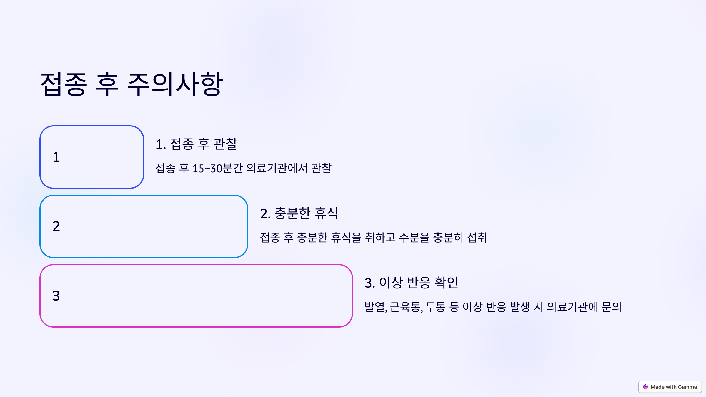 접종 후 충분한 휴식과 수분 섭취가 필요합니다.