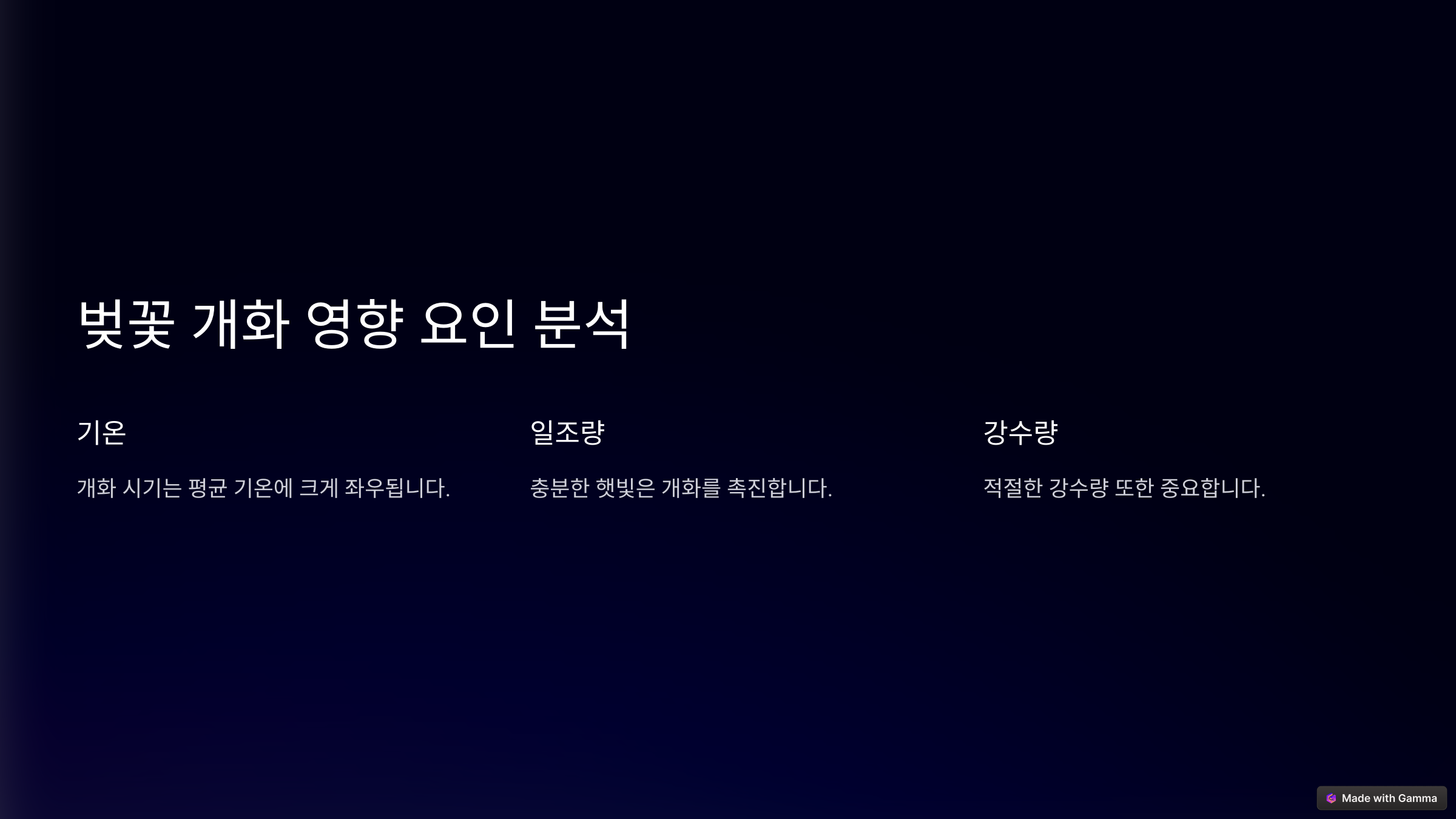 | 기온 | 봄철 평균 기온이 높을수록 벚꽃이 빨리 핌 |