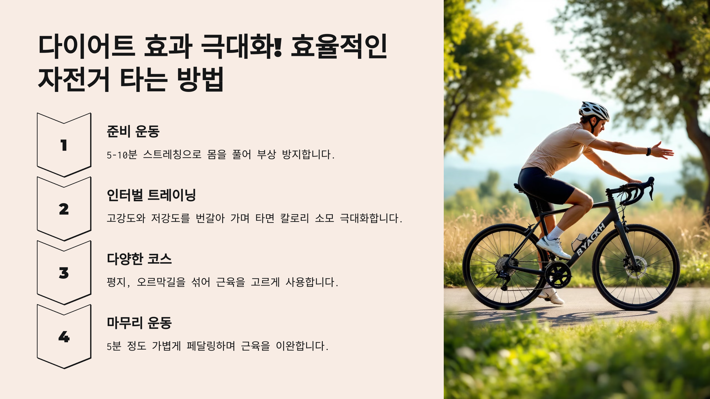 자전거 다이어트 효과를 높이려면 올바른 자세를 유지하고, 인터벌 트레이닝을 활용하며, 식단까지 함께 관리하는 것이 중요해요. 🚴♂️💪