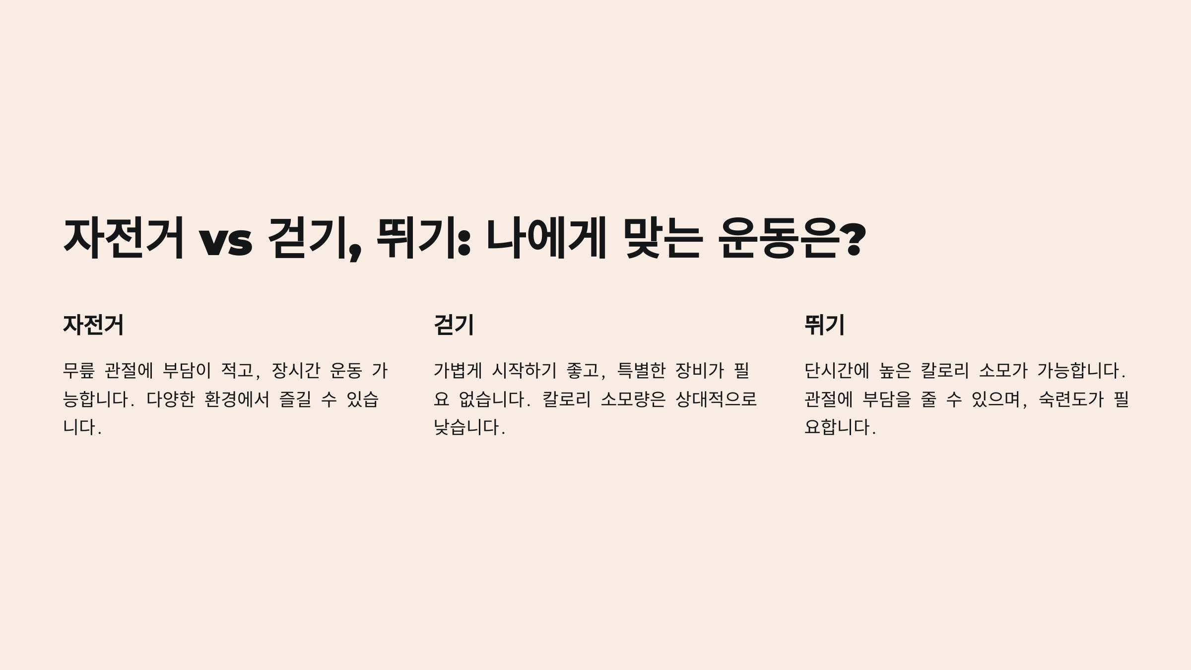 그렇다면, 자전거 타기와 다른 유산소 운동을 비교하면 어떤 차이가 있을까요? 🤔