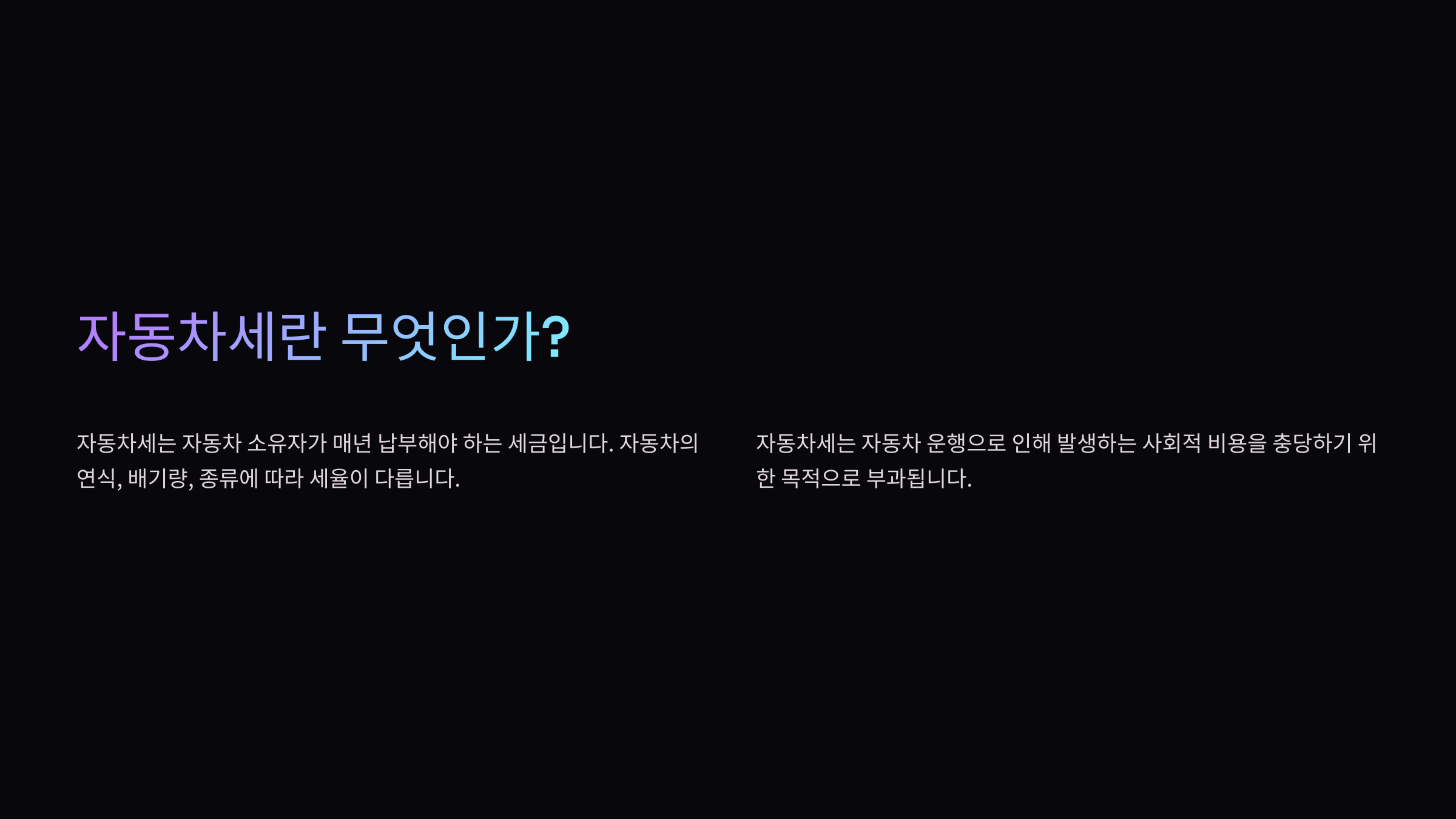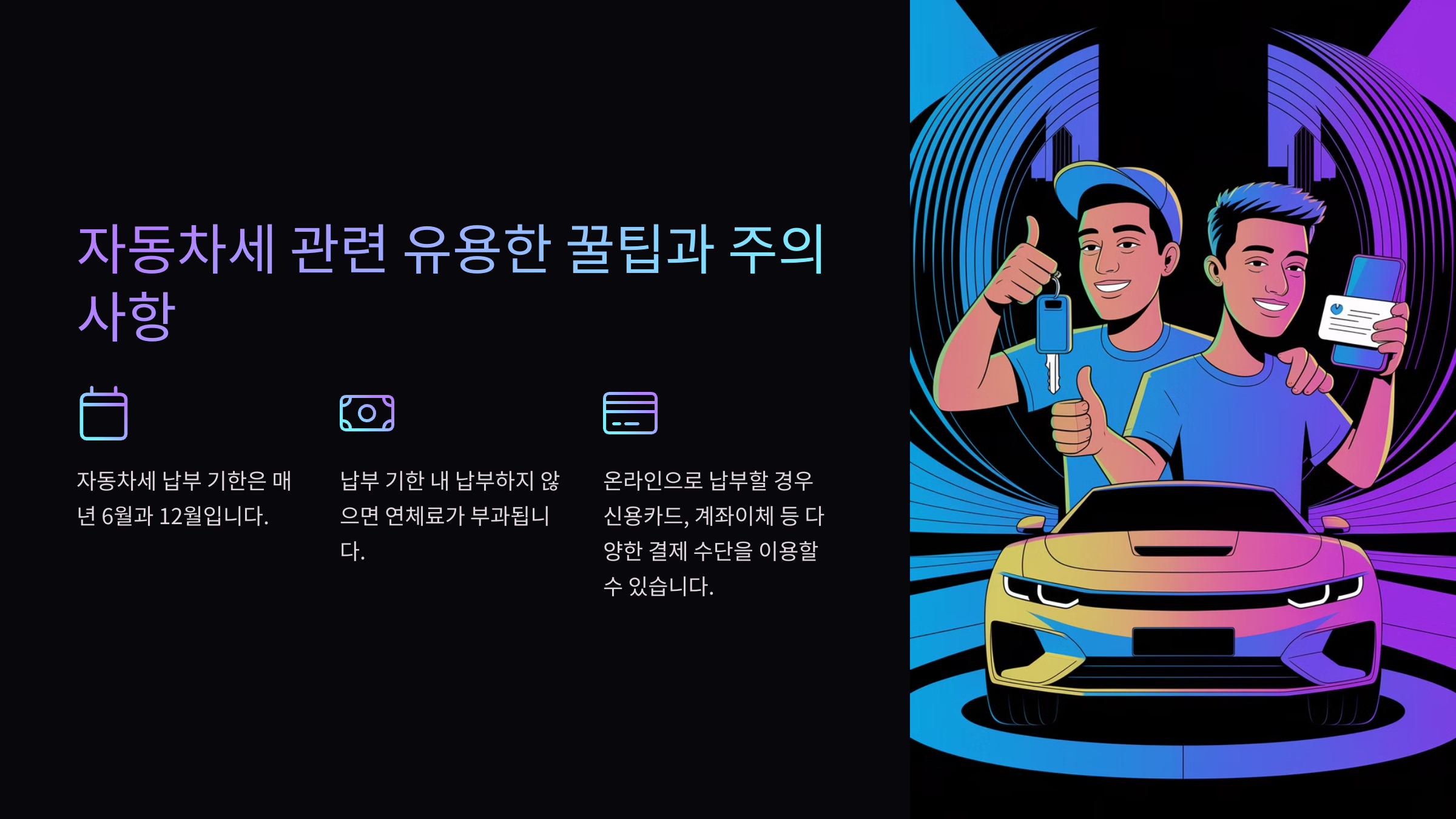 🚗 자동차를 소유하고 있다면 매년 6월과 12월에 자동차세를 납부해야 해요. 자동차세는 지방세로, 각 지자체에서 부과하는 세금이에요. 차량의 배기량이나 환경 부담금 등에 따라 세금이 달라질 수 있답니다.
