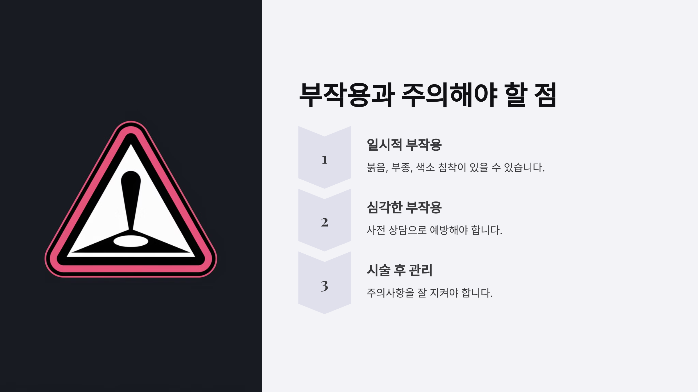 그럼, 시술 후 발생할 수 있는 부작용과 주의사항에 대해 알아볼까요? 다음 섹션에서 자세히 설명해드릴게요!
