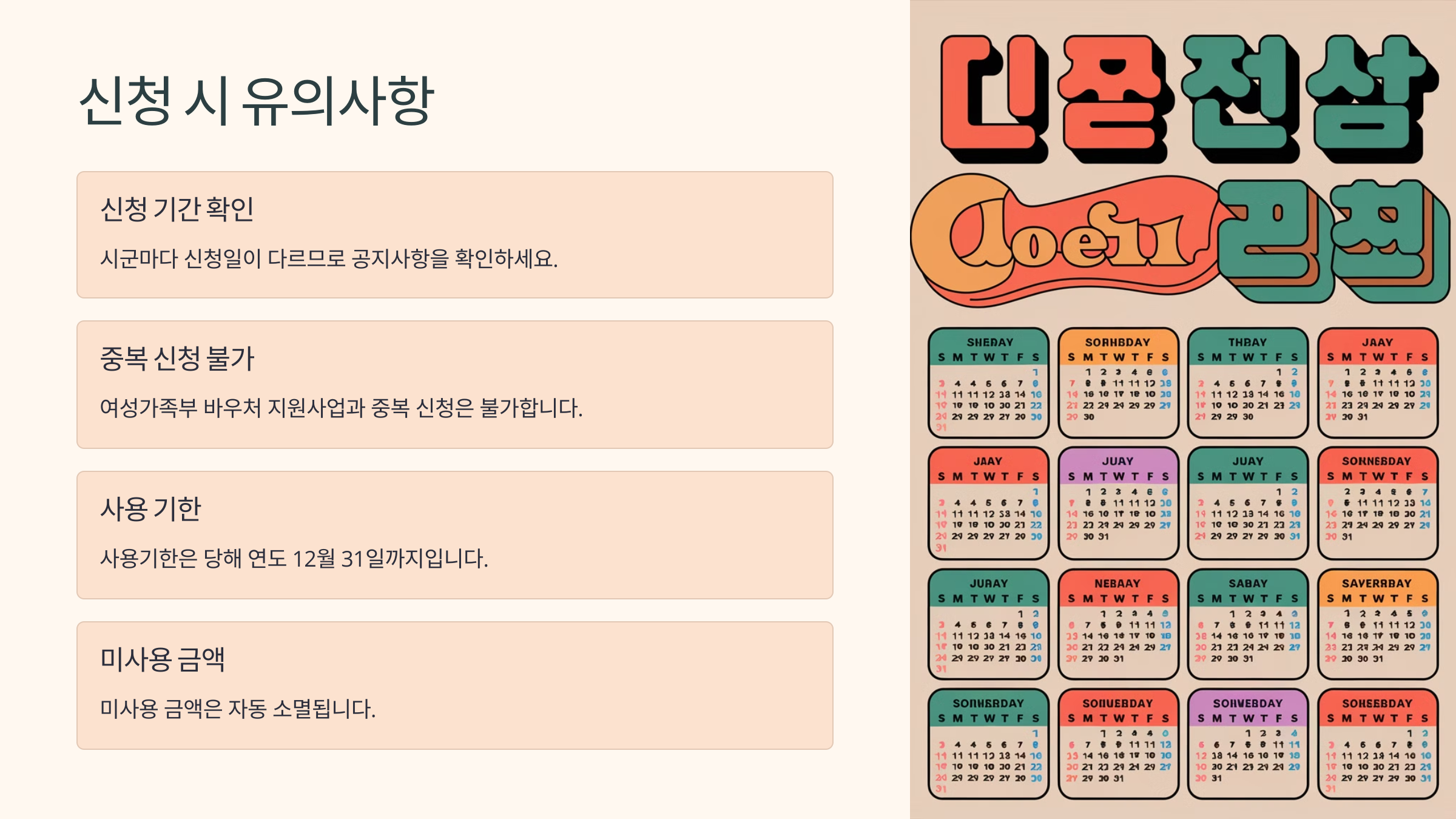 바우처를 어떻게 사용하는지 알았다면, 이제 신청할 때 꼭 알아야 할 유의사항도 확인해 볼까요? 😊