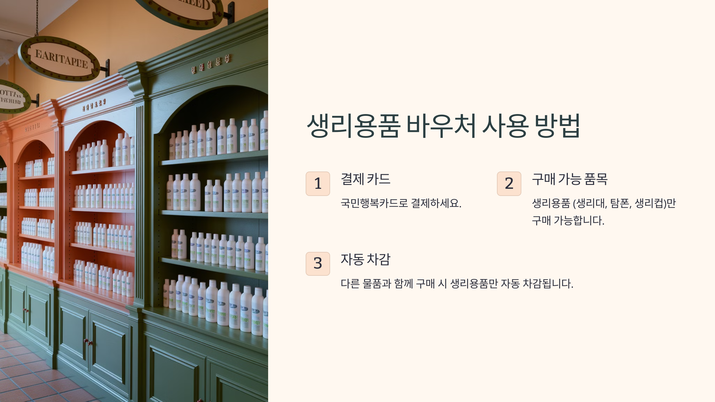 • 🚫 바우처는 지정된 생리용품 외 다른 물품에는 사용할 수 없어요.