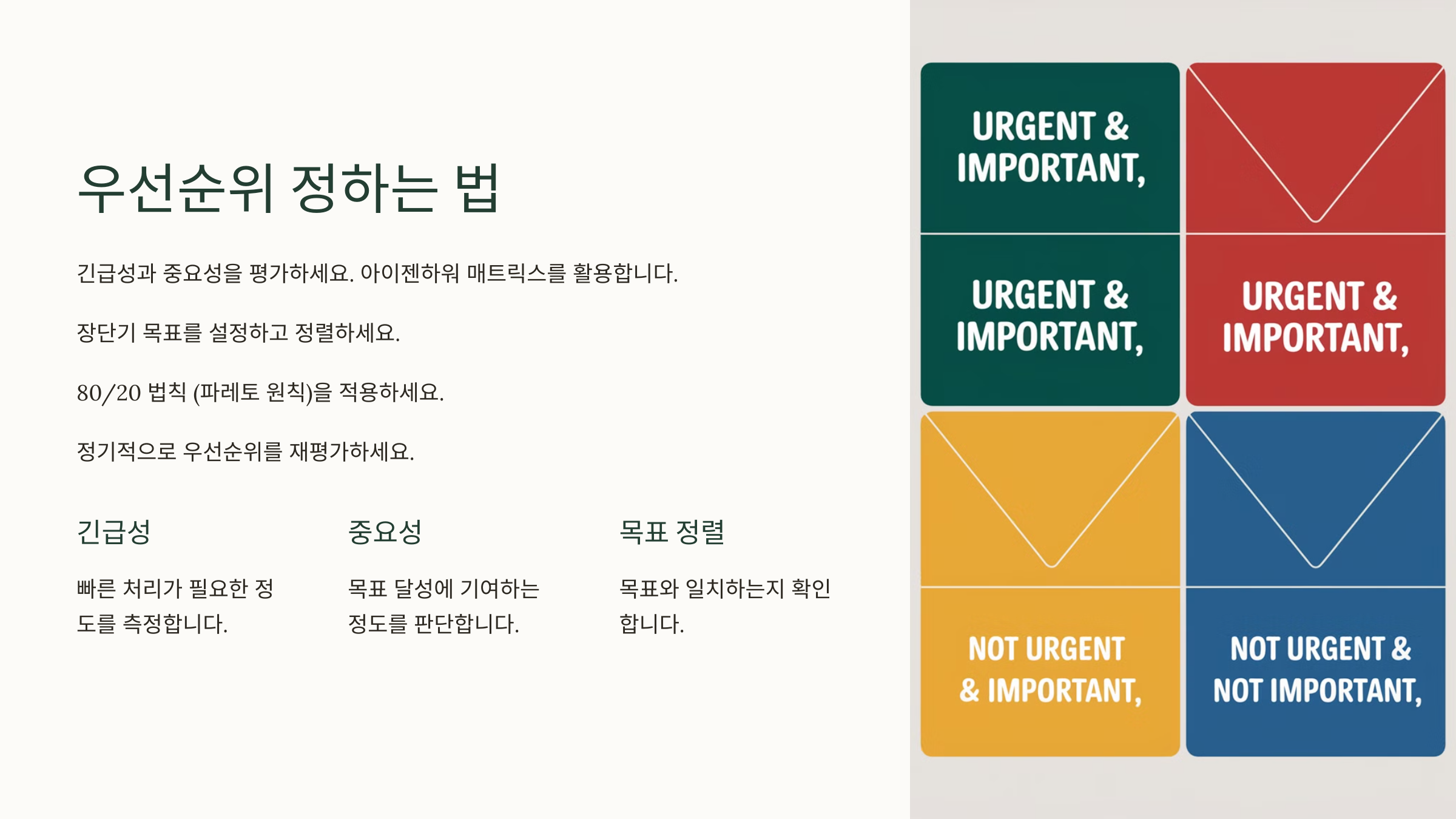 하루를 효과적으로 보내려면 **가장 중요한 일부터** 해야 해요. 하지만 많은 사람들이 급한 일에 쫓기다 보니, 정작 중요한 일을 놓치는 경우가 많아요. 그래서 **우선순위를 정하는 방법**이 필요해요.