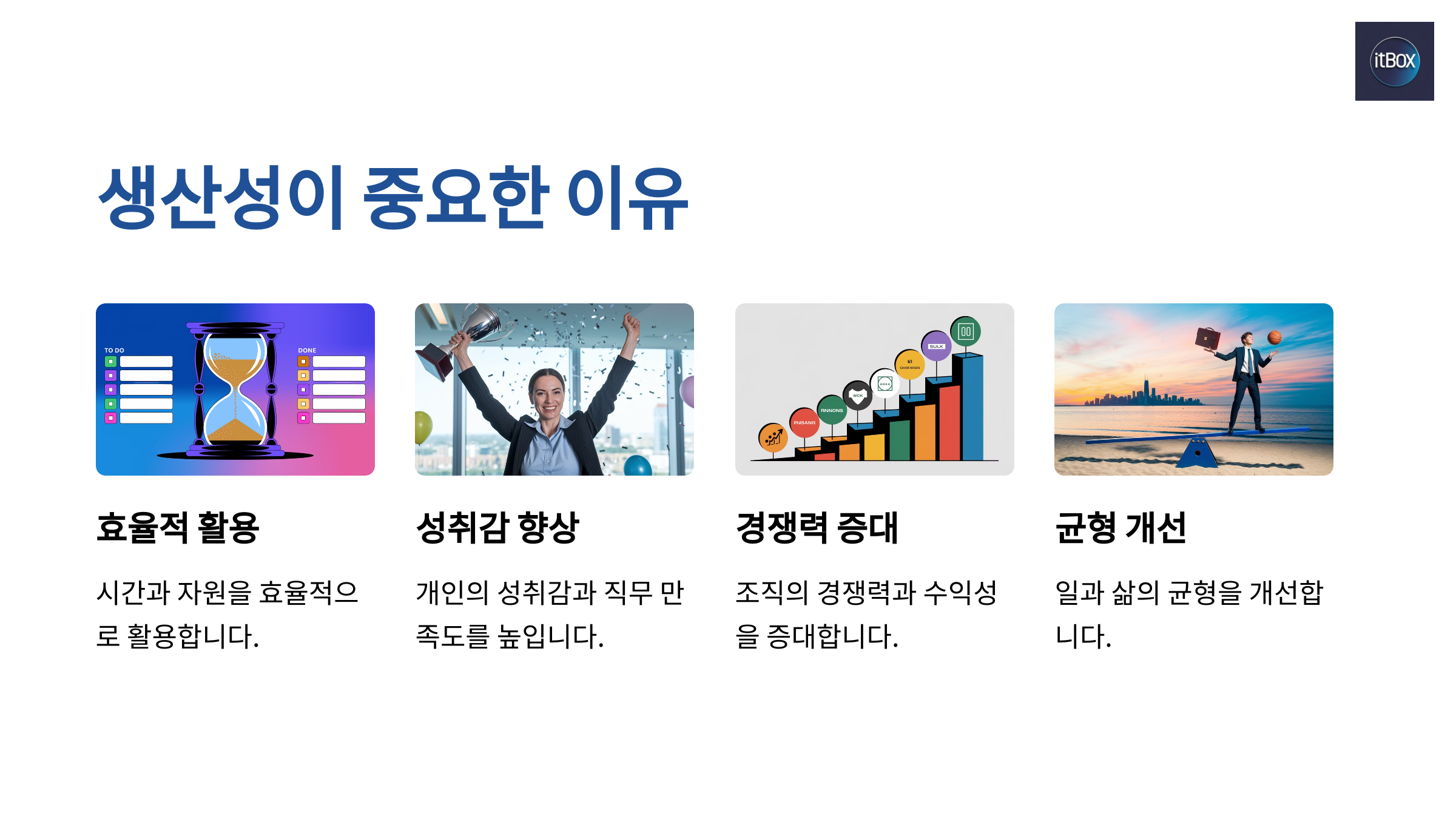 생산성을 높이면 단순히 더 많은 일을 하는 것이 아니라, **더 적은 시간에 더 큰 성과를 내는 것**이 가능해져요! 📈