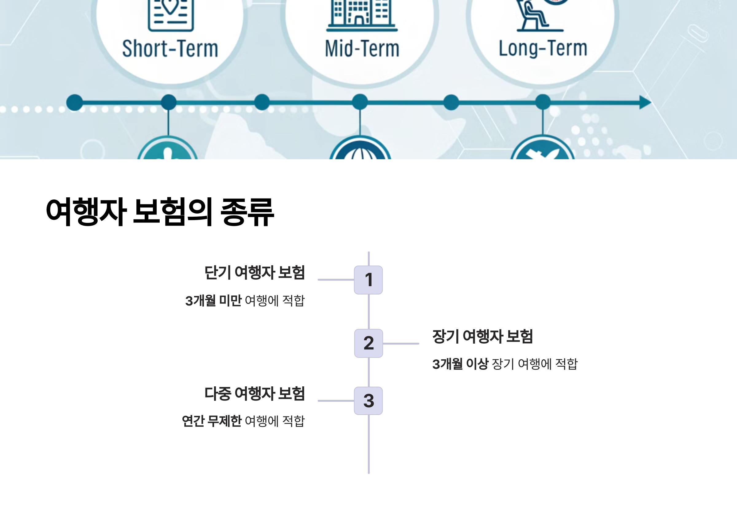 | 🌏 장기 여행자 보험 | 3개월~1년 이상 여행하는 경우 | 워킹홀리데이, 유학생 |