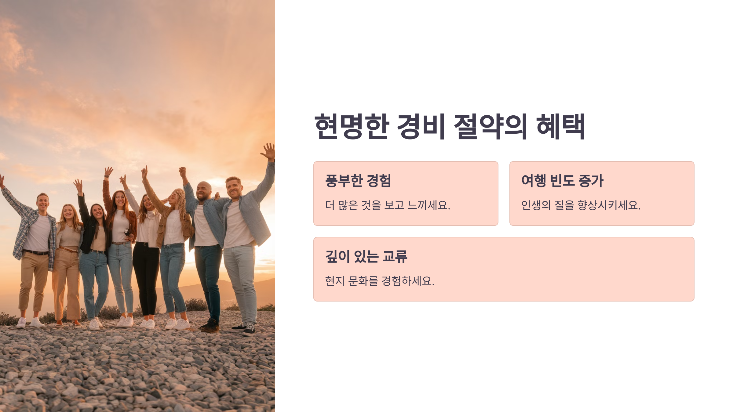 • ✔ **더 오래 여행할 수 있음**: 예산을 효율적으로 사용하면 여행 기간을 연장할 수 있어요.