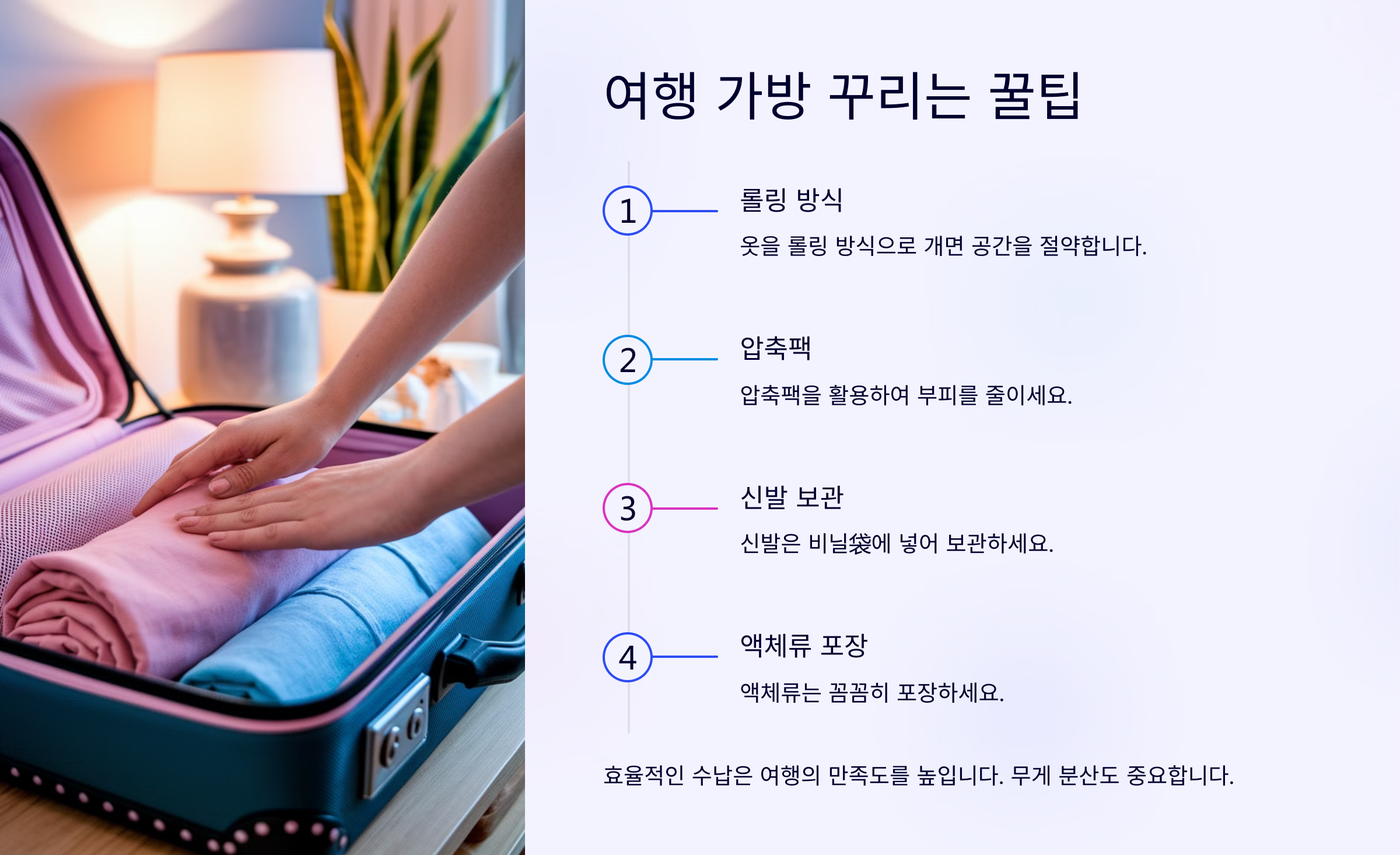 - ✔ **여행용 압축팩 사용**: 부피를 30~50% 줄일 수 있어요.