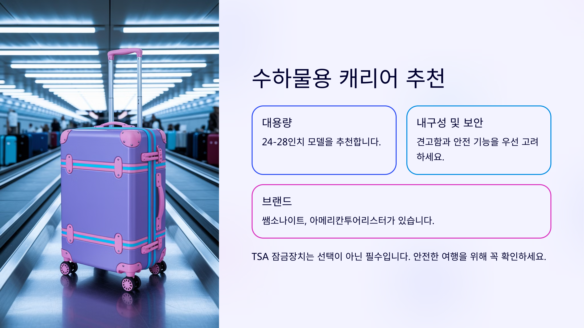 장거리 여행에서는 **수하물용 캐리어가 튼튼해야 해요.** 무거운 짐을 넣어도 바퀴가 부드럽게 굴러가야 하고, 충격에도 강해야 합니다. 🏋️♂️
