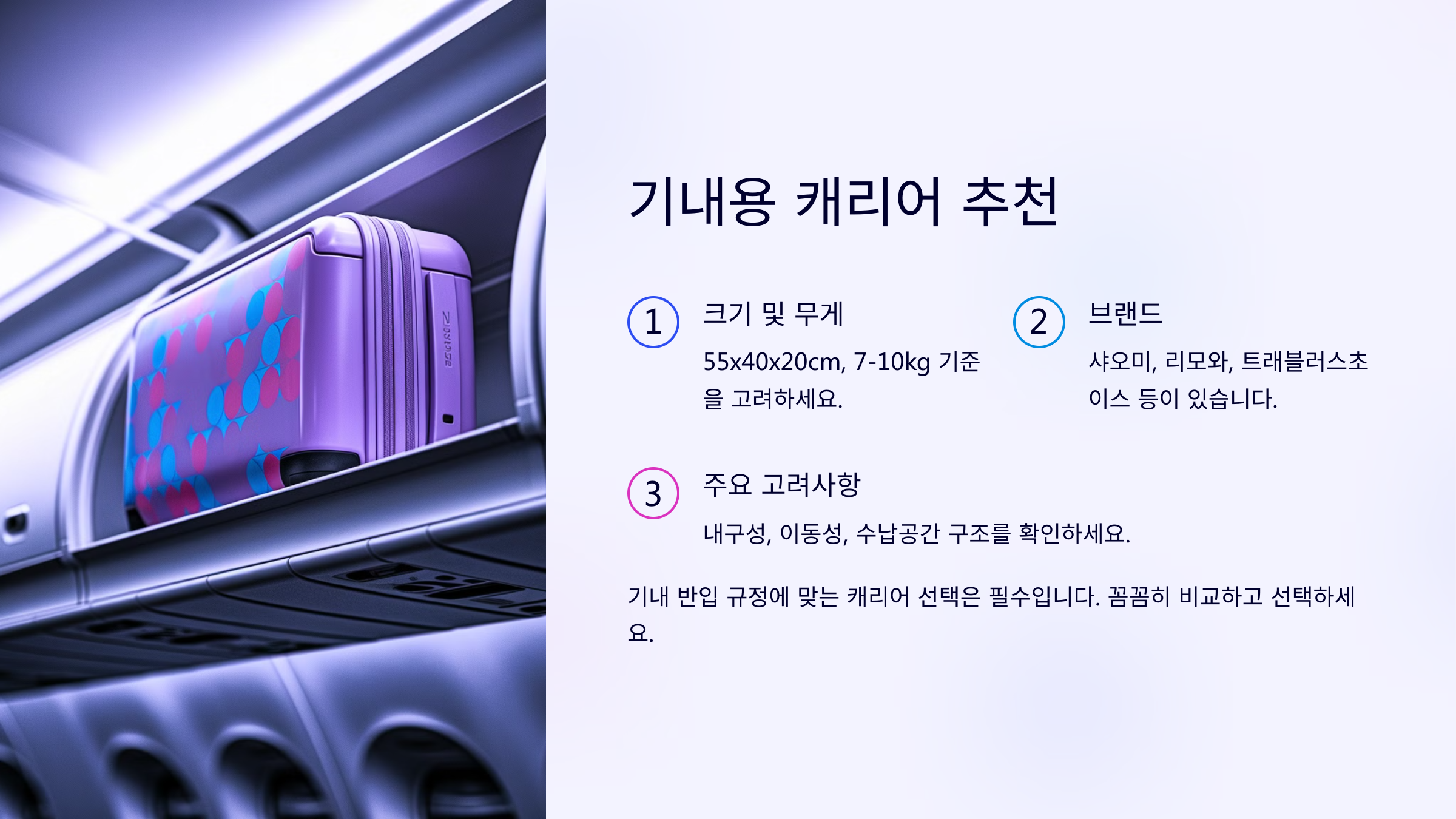 기내용 캐리어는 **가볍고, 튼튼하며, 항공사 규격에 맞아야** 해요. ✈️🧳