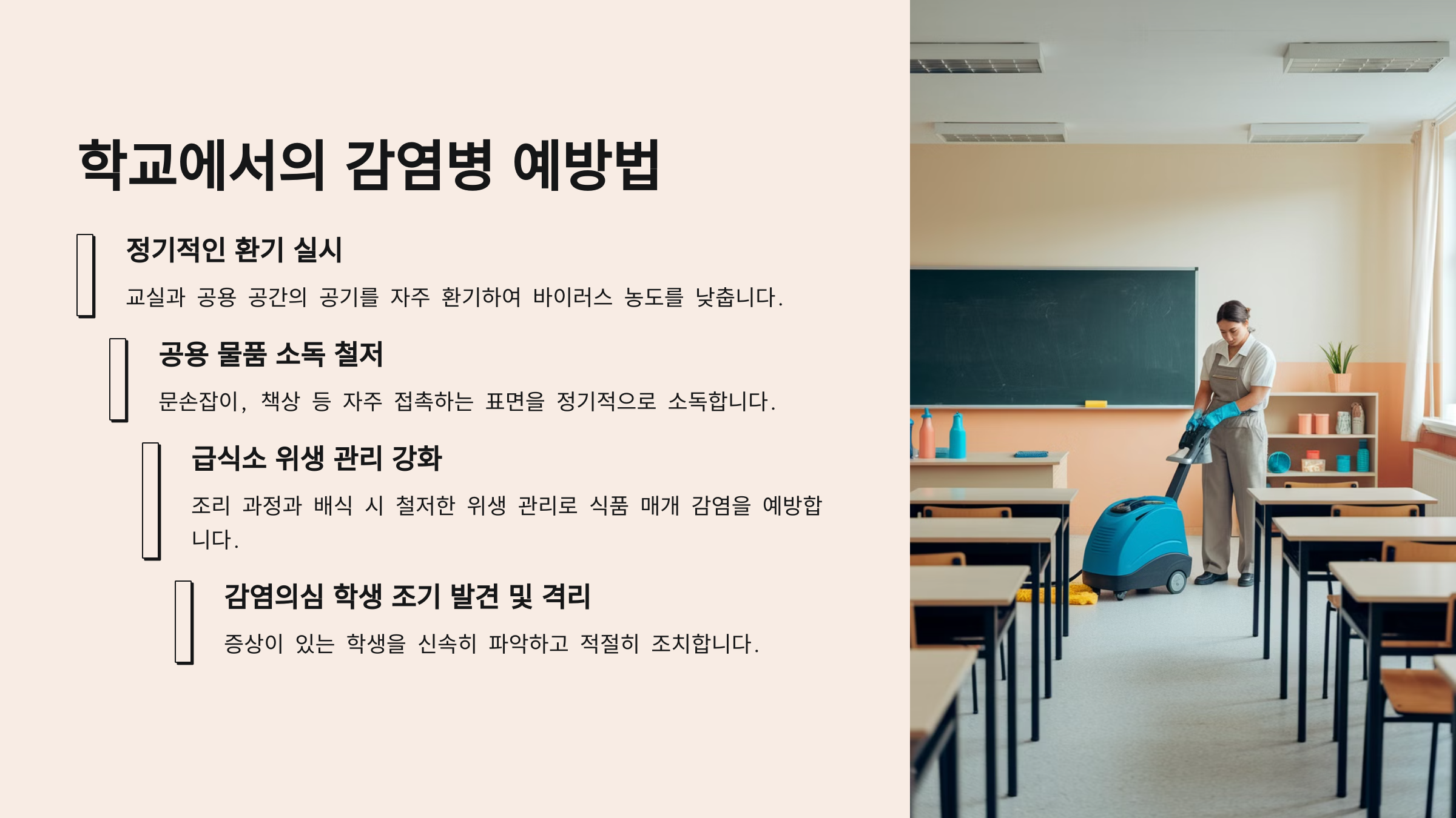 그럼 감염병을 예방하기 위해 학교에서 어떤 조치를 취해야 하는지 알아볼까요? 🏫
