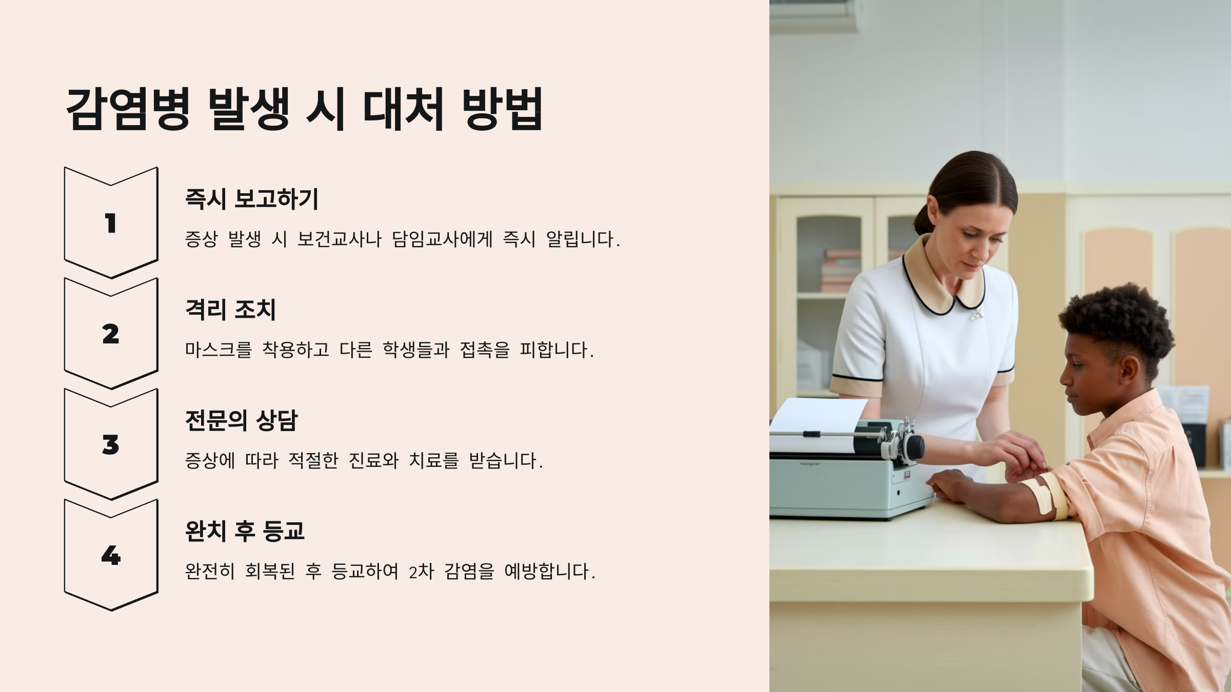 학교에서 감염병이 발생하면 빠르게 대응하는 것이 가장 중요해요. 내가 아프더라도 다른 친구들에게 전파되지 않도록 주의해야 해요.
