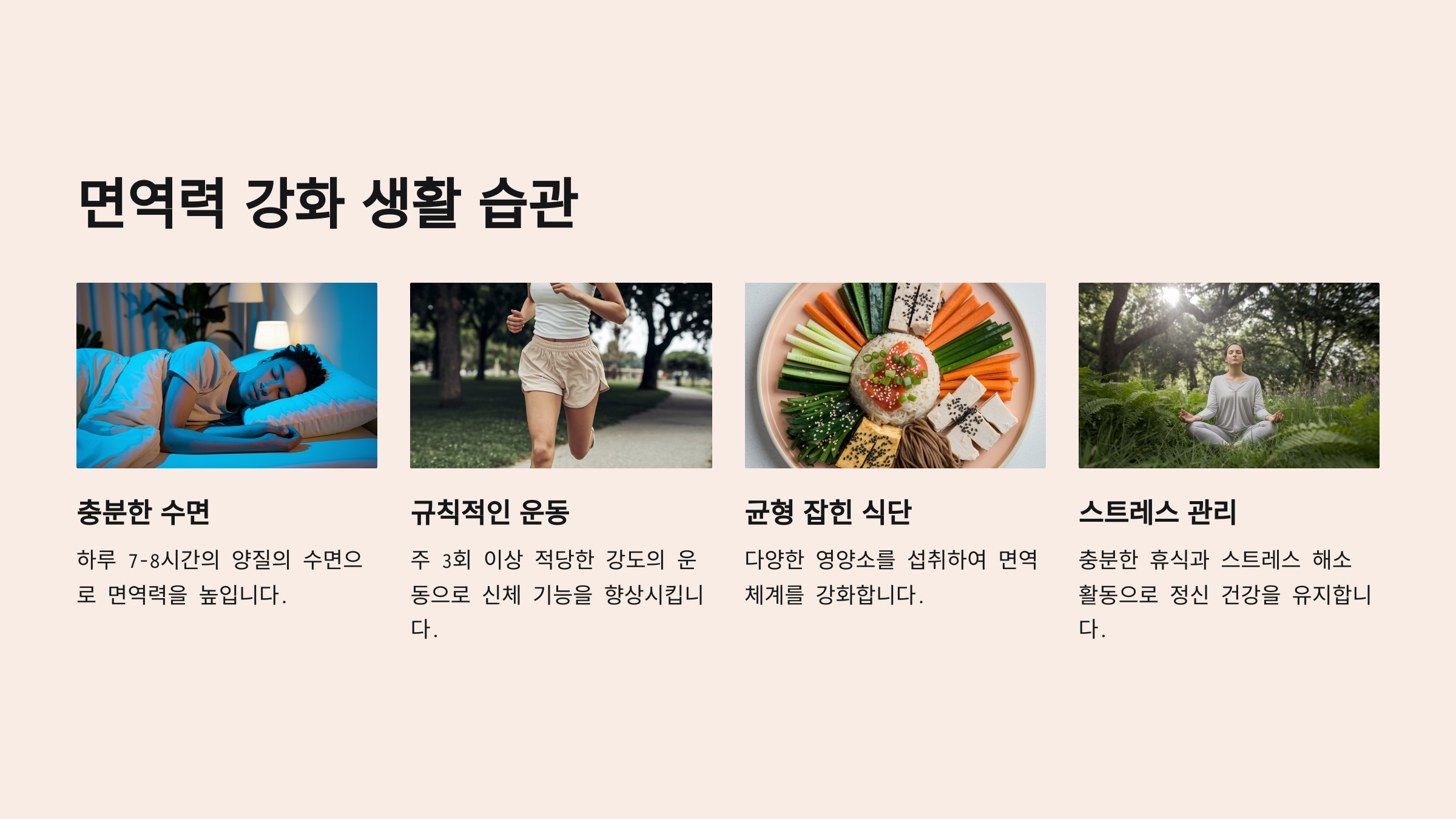 면역력을 높이는 가장 좋은 방법은 균형 잡힌 식사, 충분한 수면, 규칙적인 운동이에요. 여기에 스트레스 관리까지 더하면 더욱 건강한 몸을 만들 수 있어요!