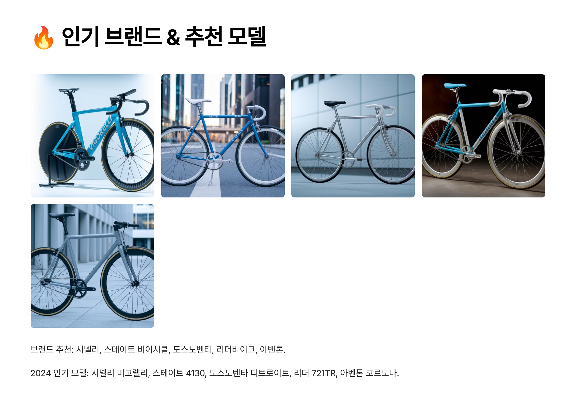 이처럼 브랜드별로 특징이 다르니, **예산과 용도에 맞는 모델을 선택하는 게 중요해요.** 만약 빠른 속도를 원한다면 LEADER BIKE나 CINELLI를, 가성비를 원한다면 STATE BICYCLE을 추천해요! 🚲🔥