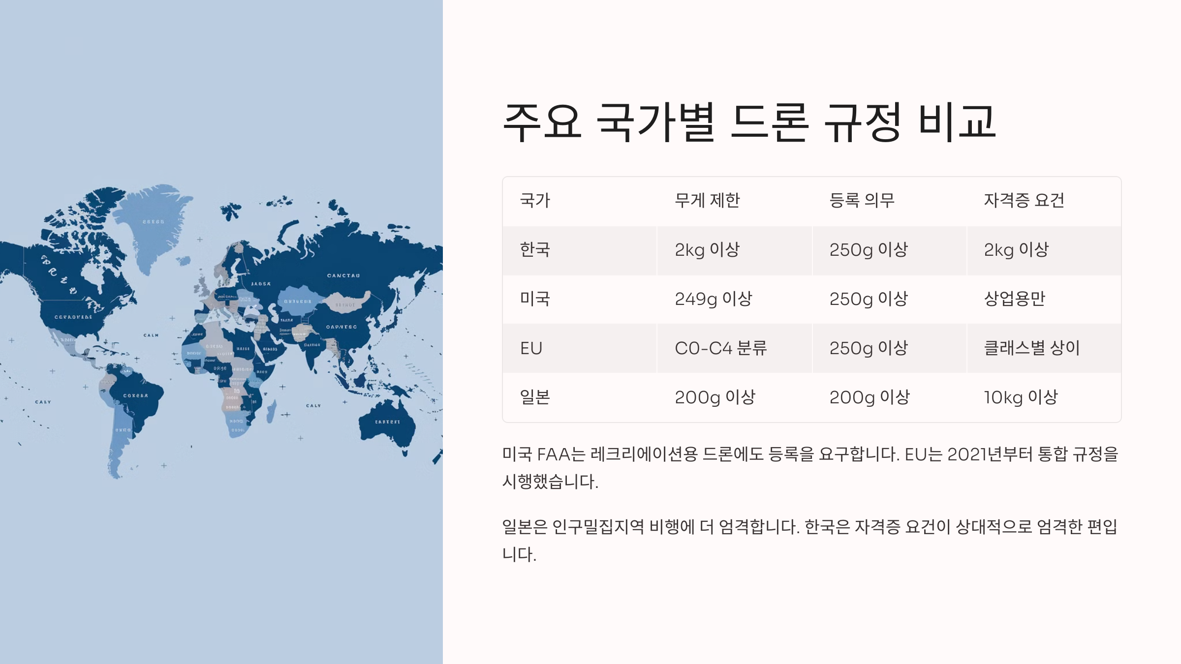 • 📌 **드론 등록 필수 여부:** 미국, 유럽, 중국 등은 기체 등록이 필요할 수 있음.