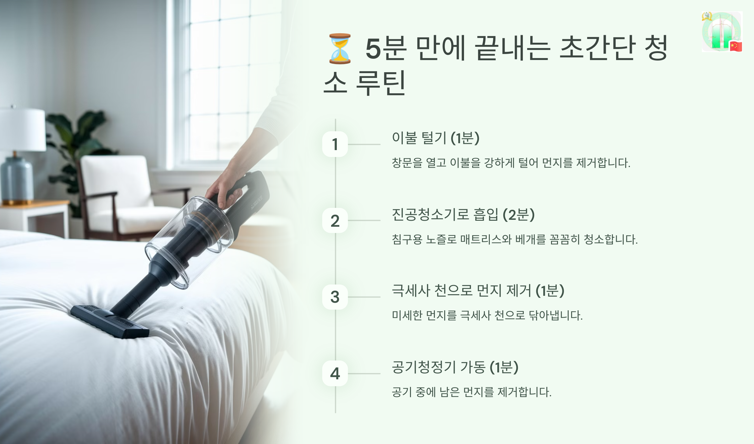 ⏳ 단 5분만 투자하면 깨끗한 침구 환경을 유지할 수 있어요! 매일 꾸준히 실천해 보세요. 😊