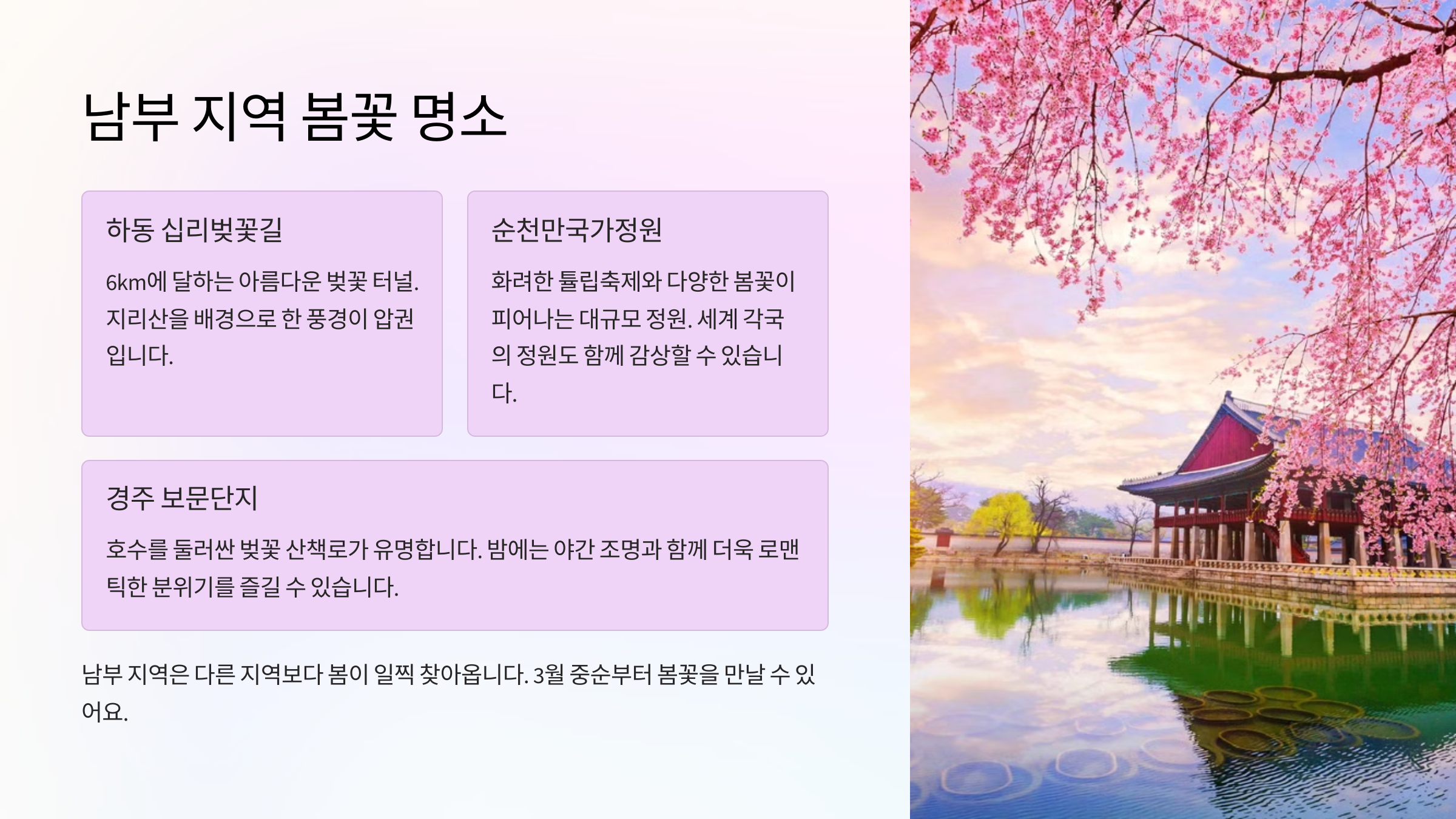 A1. 남부는 3월 말~4월 초, 중부는 4월 초~중순이에요. 매년 날씨에 따라 달라져요!