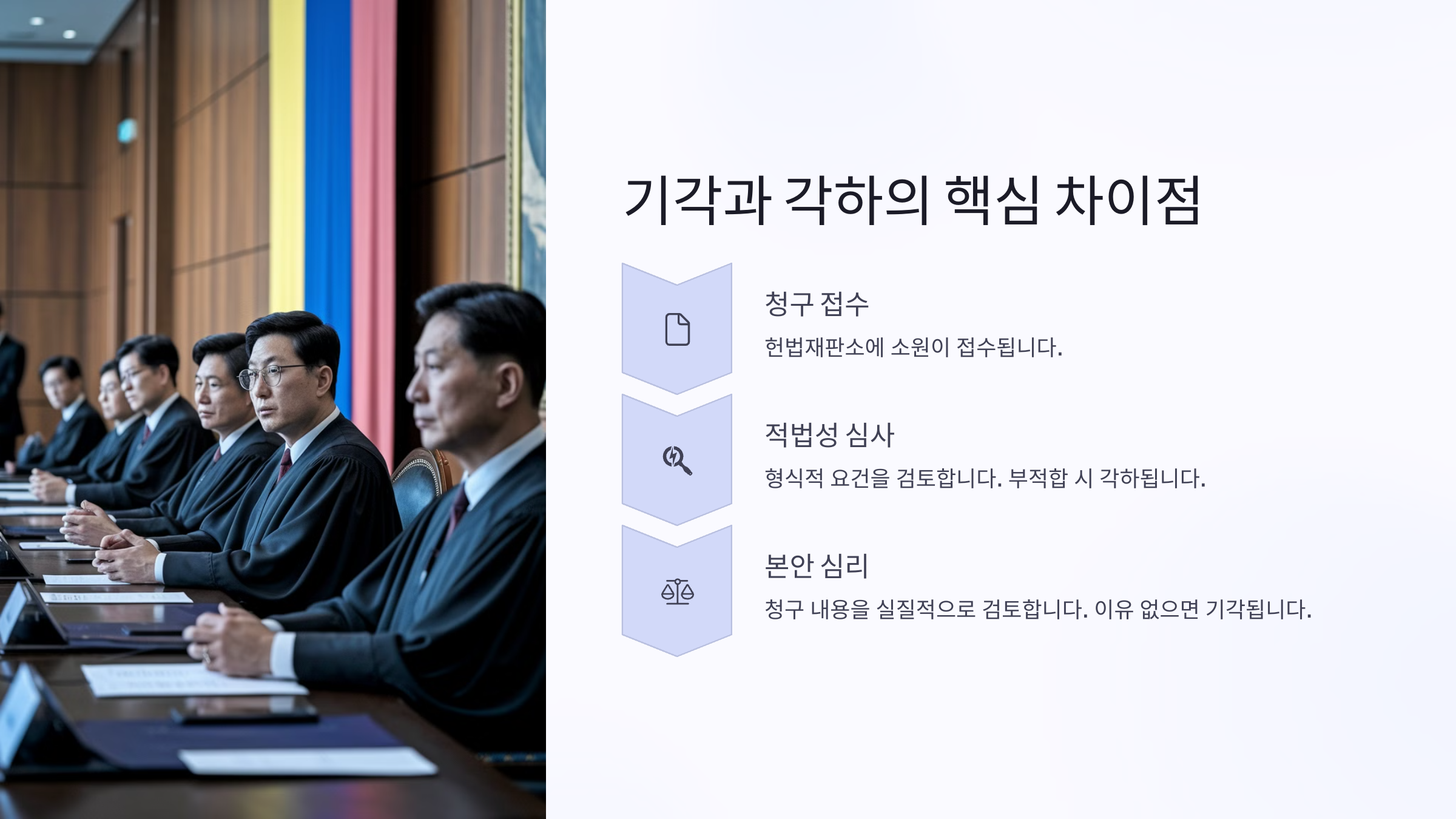 기각과 각하의 본질적인 차이는 ‘실질적 판단 여부’에 있어요. 기각은 헌법재판소가 사건의 본질, 즉 실제 위헌 여부에 대해 검토한 결과 받아들이지 않은 것이고, 각하는 애초에 사건을 판단할 수 있는 조건이 충족되지 않아 본안에 들어가지도 못하고 끝나는 거예요.