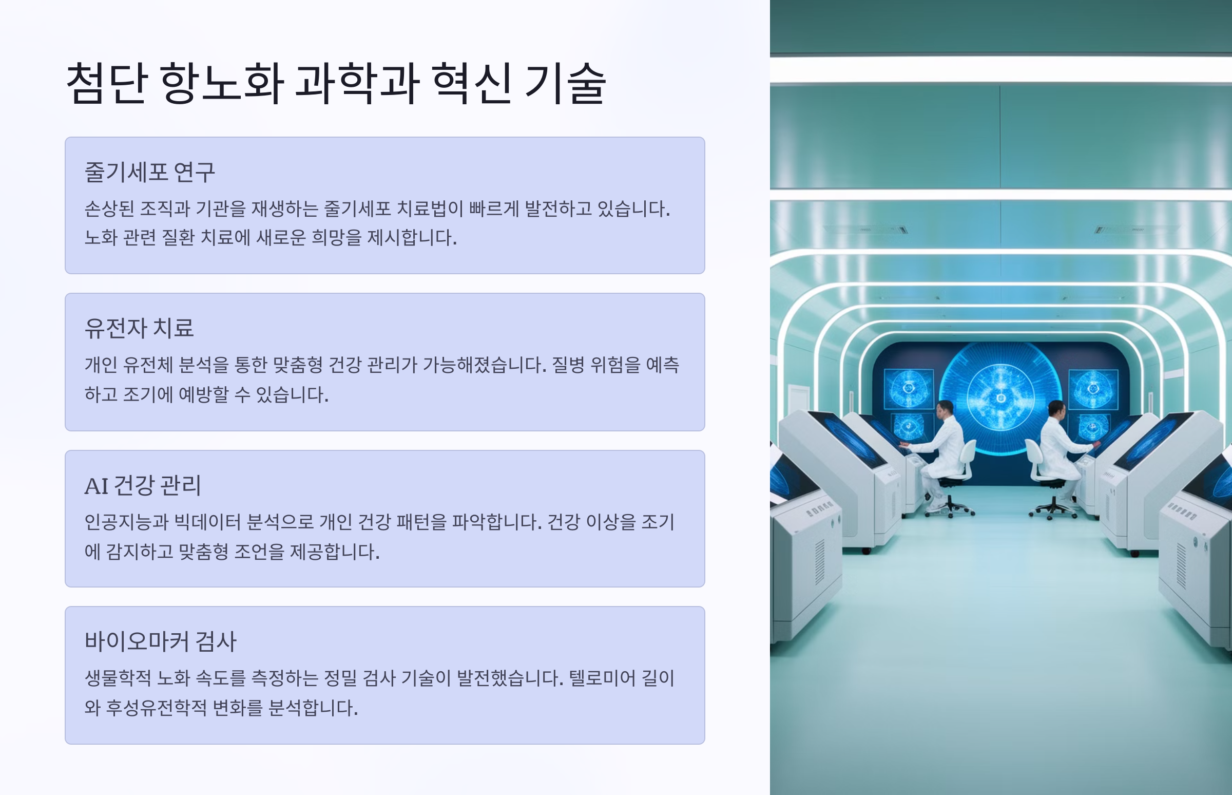 저속노화는 단순한 생활 습관의 개선을 넘어서, 과학의 힘으로도 실현 가능해지고 있어요. 특히 2025년 현재, 바이오 기술과 유전학, 인공지능이 결합되면서 노화를 근본적으로 분석하고 조절할 수 있는 방법들이 활발히 연구되고 있답니다. 노화를 질병으로 간주하고 이를 ‘치료’하려는 흐름이 전 세계적으로 확산 중이에요.