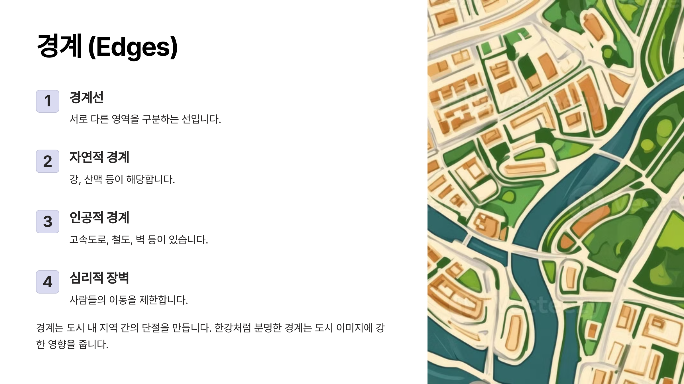 또한 경계는 방향성을 제공하기도 해요. "강을 건너면 분위기가 달라진다"는 식의 직관적 인식이 가능하게 해줘요. 이러한 경계는 사람들에게 도시의 ‘층’을 이해시키는 데 중요한 역할을 해요.