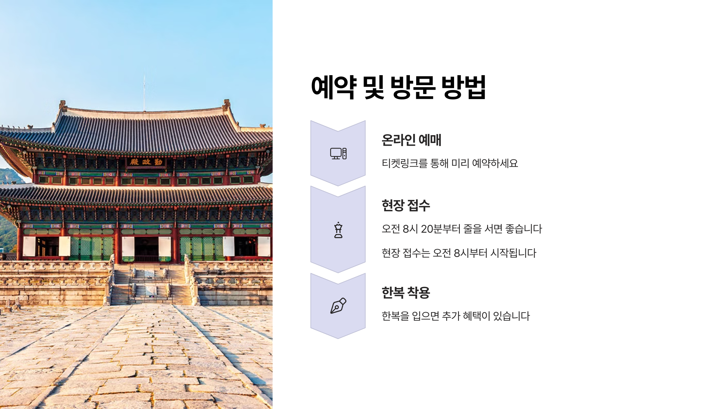 운영 일정은 문화재청 또는 한국문화재재단 홈페이지, 그리고 '궁중문화축전' 공식 채널을 통해 확인 가능해요. 오픈과 동시에 마감되는 경우가 많기 때문에 알림 설정은 필수! 다음 섹션에서는 '그렇다면 예약 없이도 가능할까?' 하는 핵심 궁금증을 파헤쳐볼게요!🔍