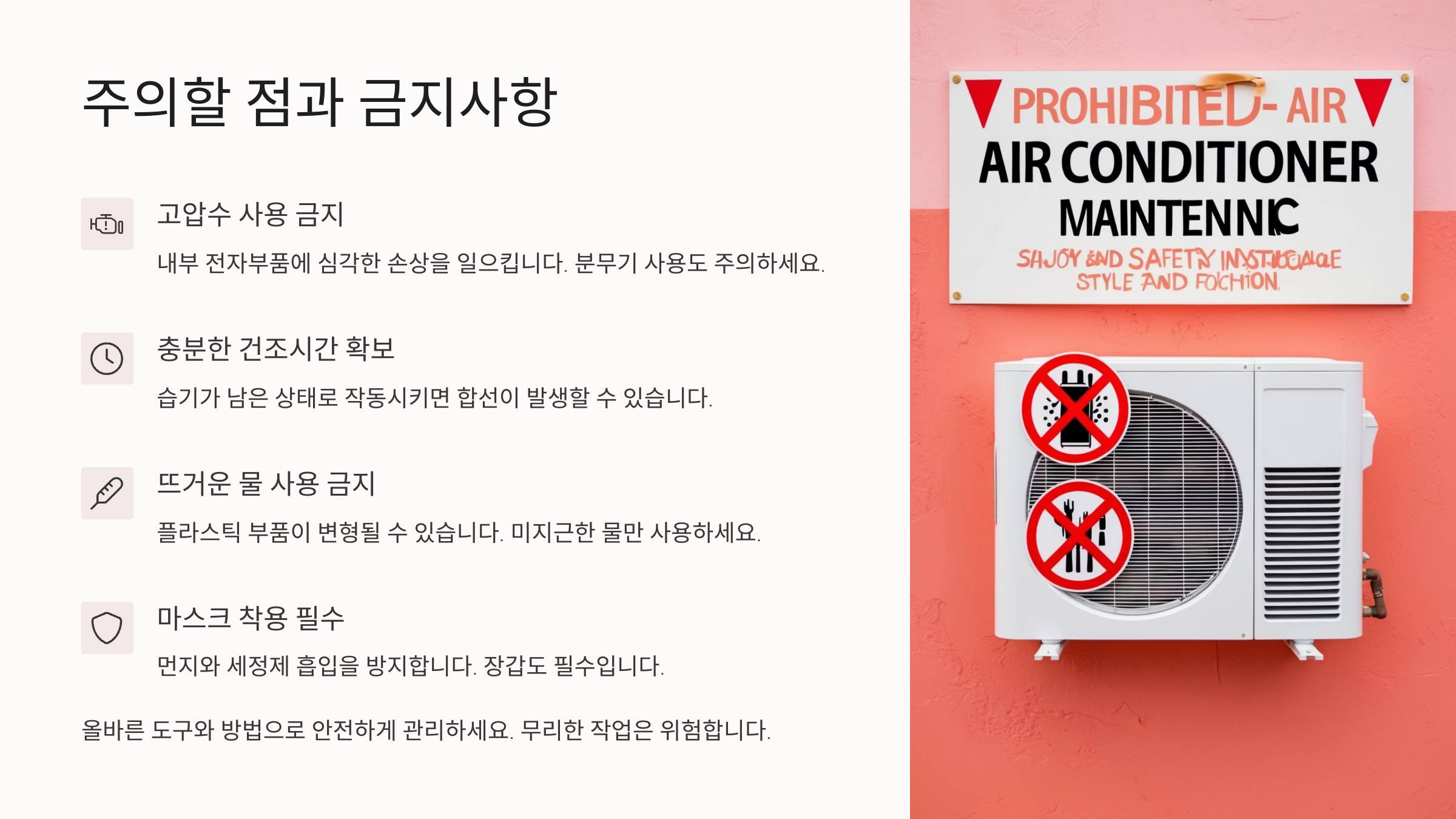 시스템 에어컨 내부 청소는 일반 가전보다 구조가 복잡하고 민감한 부품들이 많아서 주의가 정말 필요해요. 청소한다고 무턱대고 분해하거나 물을 많이 쓰면 오히려 고장의 원인이 될 수 있어요. 자가 청소 시 반드시 지켜야 할 금지사항들을 하나씩 확인해볼게요.