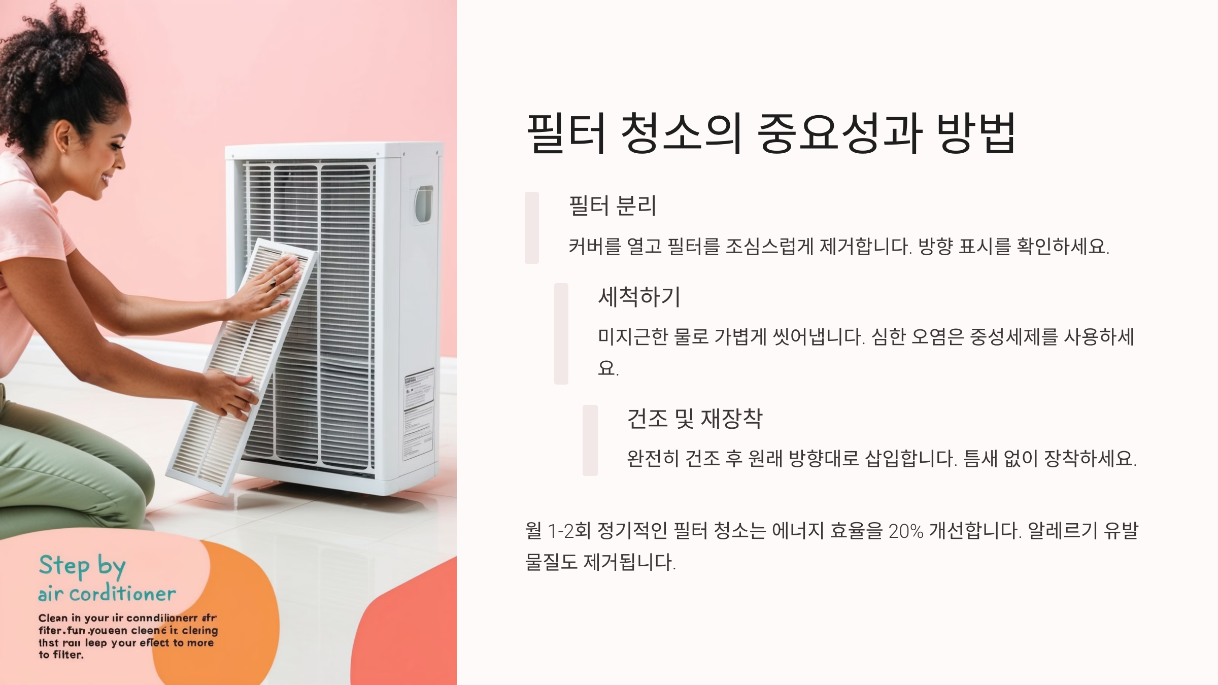 기본적으로 **필터 청소는 2주~1달에 한 번**이 좋아요. 사무실, 매장처럼 사람이 많이 드나드는 공간은 특히 자주 청소해야 해요. 필터 상태만 좋아도 냉방 효율은 확 올라가요.