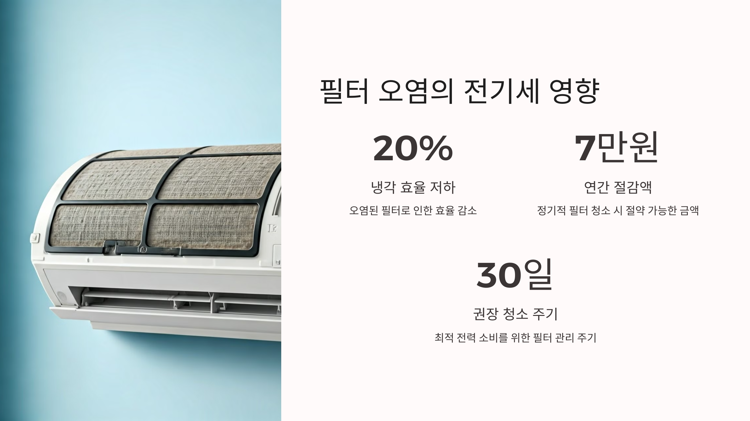 이제 청소가 왜 중요한지 감이 오셨죠? 다음은 필터가 오염됐을 때, 전기세가 어떻게 치솟는지 더 자세히 알려드릴게요!