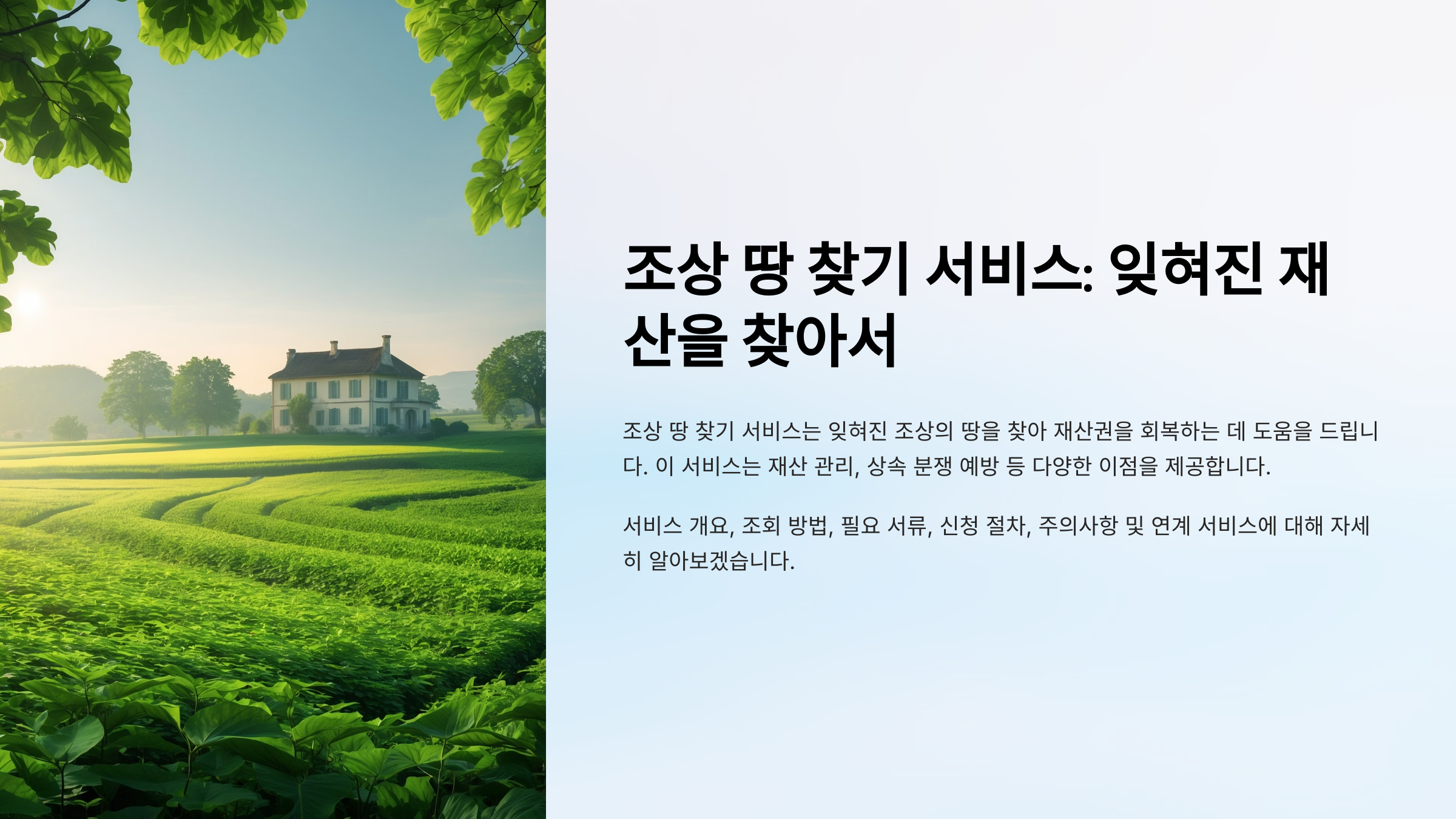 ‘조상 땅 찾기 서비스’는 돌아가신 가족, 즉 사망자의 명의로 남아 있는 전국의 토지 소유 현황을 조회할 수 있는 행정 서비스예요. 토지 소유자 본인이 아닌, 상속인(자녀, 손자녀, 배우자 등)이 신청할 수 있답니다.