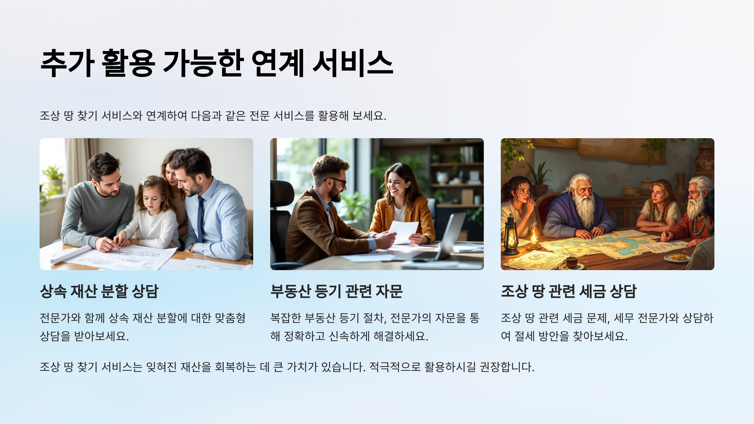 조상 땅 찾기 서비스로 ‘어디에 어떤 땅이 있는지’를 알았다면, 이제 그 다음 단계는 실질적인 상속 절차로 넘어가야 해요. 이때 함께 활용하면 좋은 행정 서비스와 부동산 정보 시스템들을 소개할게요!