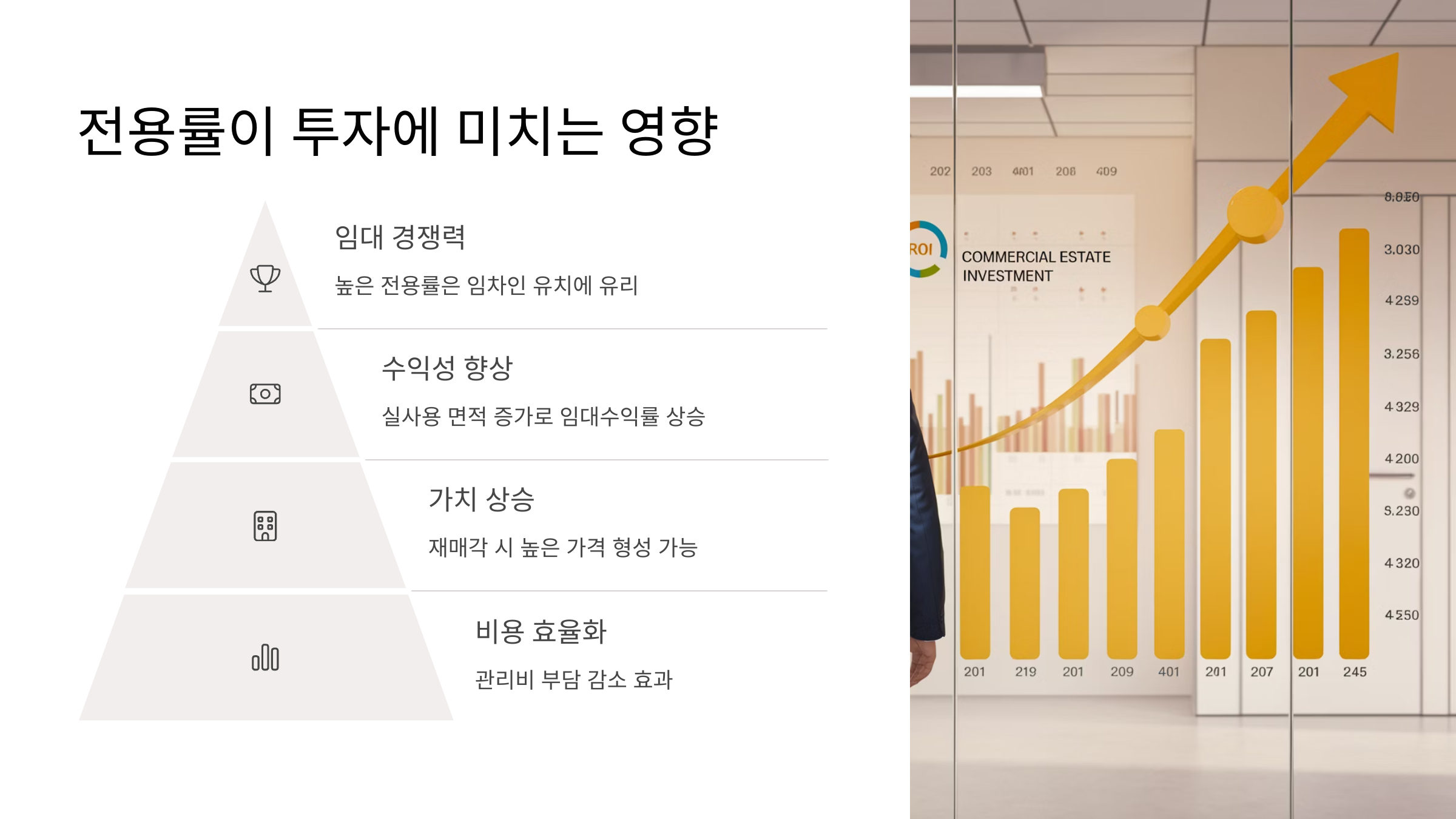 전용률이 낮을수록 관리비 비율이 높고, 전용 기준 임대료 환산 시 수익률도 떨어질 수 있어요. 반대로 전용률이 높으면 실제 사용 면적이 넓고, 수익형으로도 매력적인 공간이 될 수 있어요.
