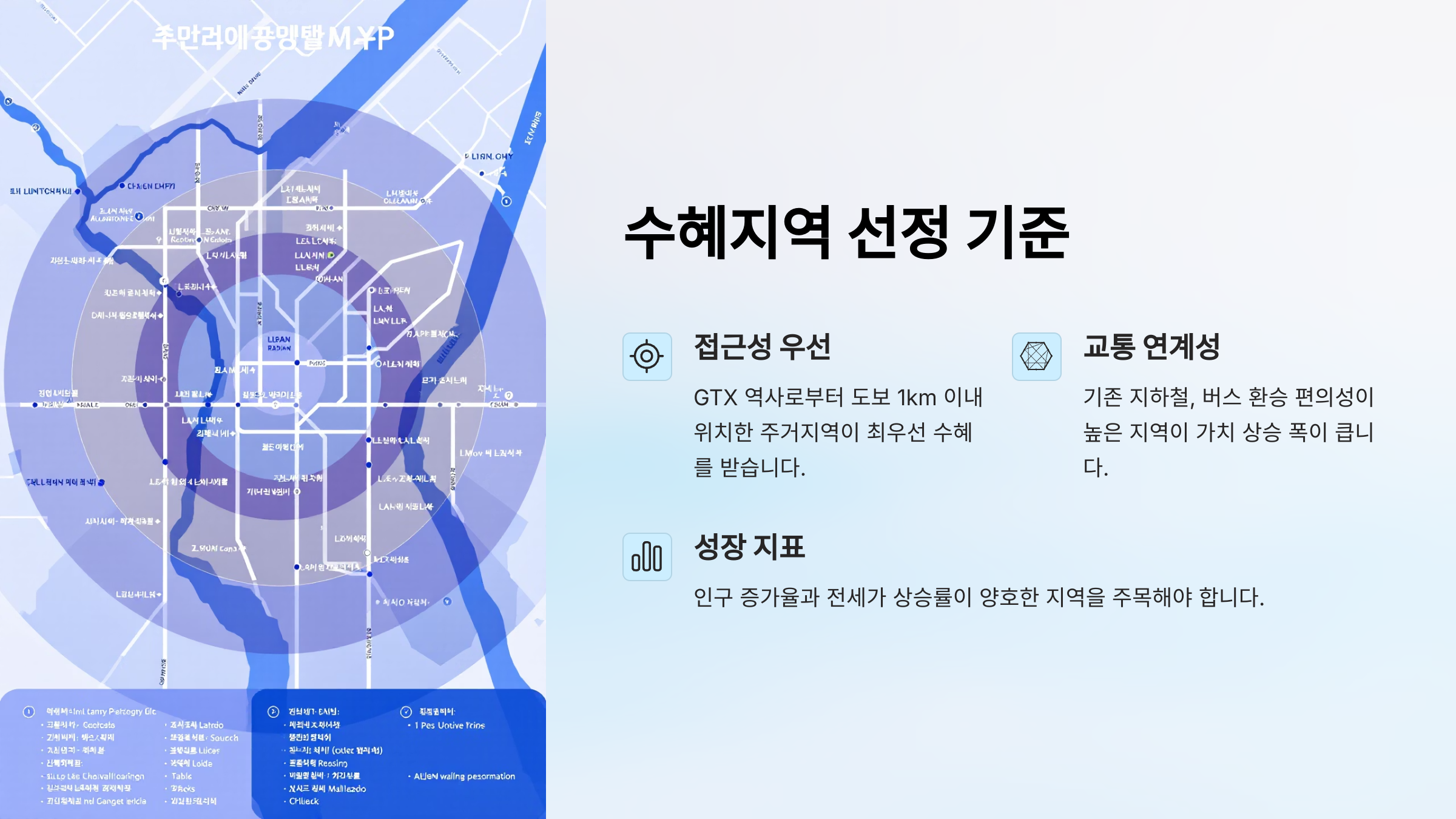 정차역에서 도보 10분 이내의 지역을 흔히 ‘핵심 수혜지역’이라 부르며, 인근 역세권 외곽까지 포함한 지역은 ‘광역 수혜지’로도 불려요. 이 둘은 향후 개발성과 가격 상승폭이 다르니 구분이 필요해요.