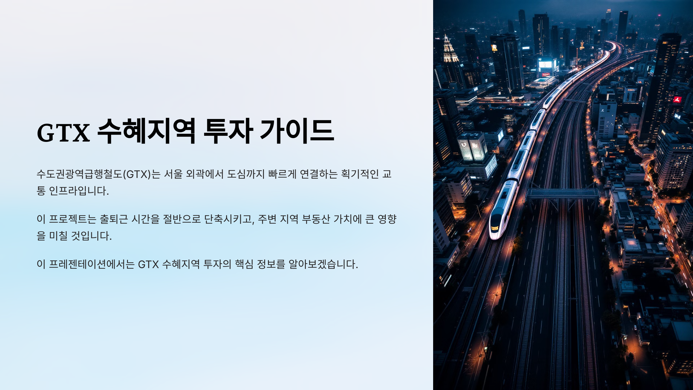 GTX 수혜지역은 말 그대로 GTX 노선이 지나가거나 정차하는 역세권 주변 지역이에요. 단순히 '역이 있다'는 것만으로도 엄청난 교통 혜택을 받게 되고, 그에 따라 생활 편의와 부동산 가치가 상승하죠.