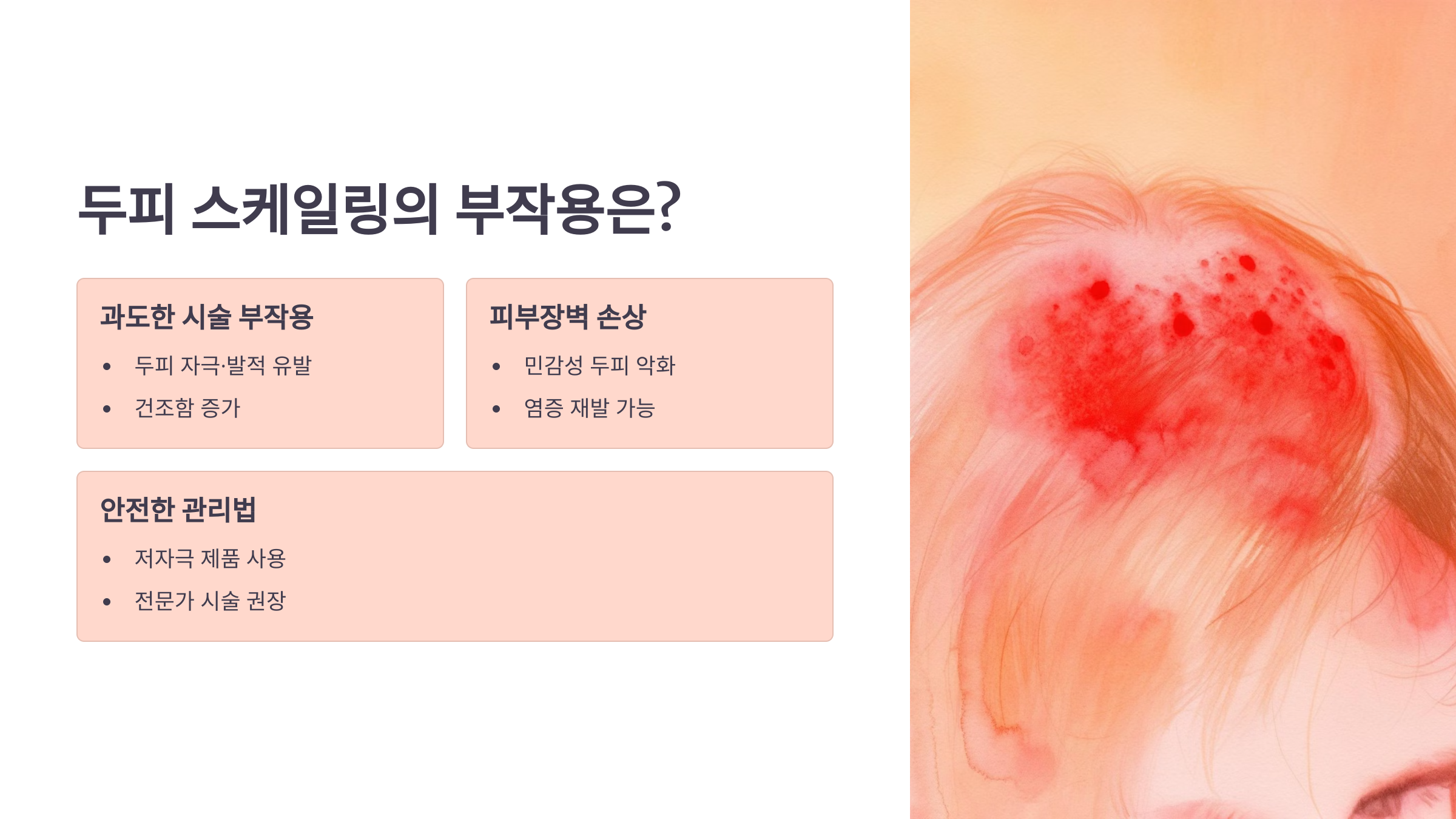 두피 스케일링은 분명 도움이 되는 관리법이지만, 무작정 자주 하거나 과하게 하면 오히려 탈모를 유발할 수 있어요. 특히 민감성 두피이거나 피부 장벽이 약한 사람에게는 자극이 될 수 있기 때문에 주의가 필요해요. 항상 ‘과유불급’이라는 말이 떠오르죠.