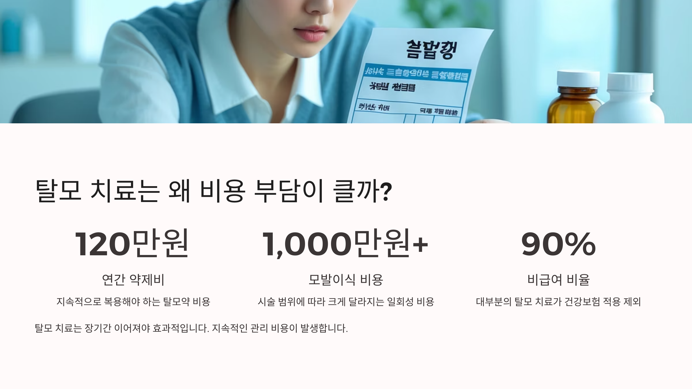 탈모 치료는 건강보험이 적용되지 않는 경우가 많아서 전액 본인 부담이에요. 특히 약물 치료, 메조테라피, 두피 주사, 모발이식 같은 시술은 대부분 비급여 항목이라서 병원마다 가격 차이도 크고, 경제적인 부담이 꽤 커질 수밖에 없어요.