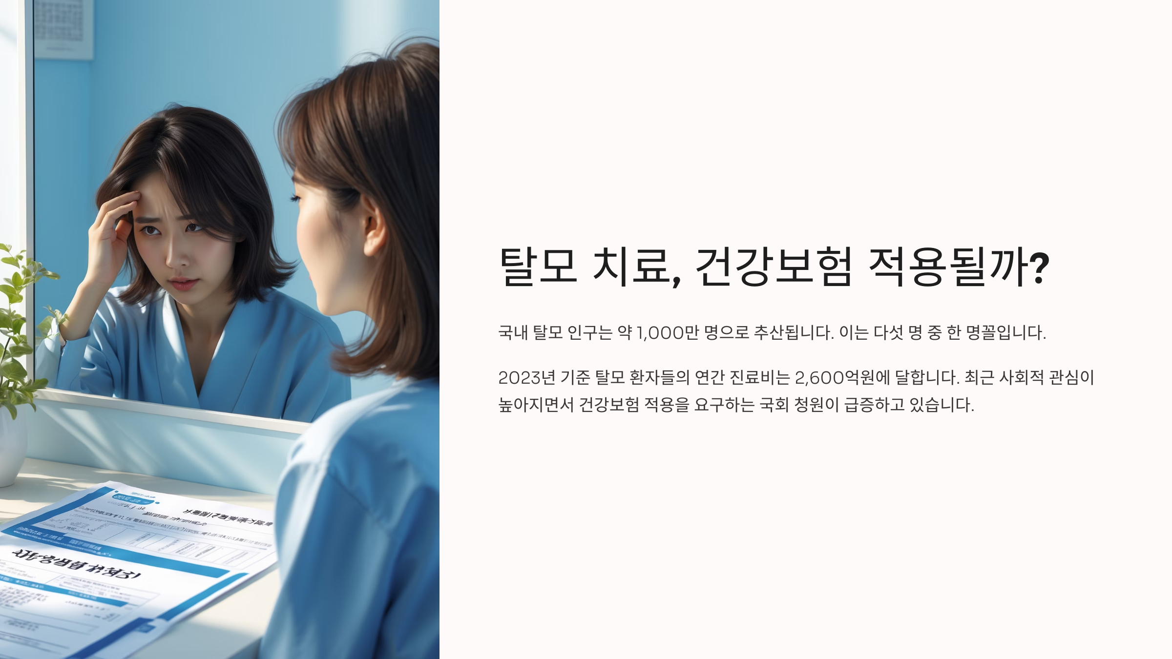현실적으로는 당장 모든 탈모에 건강보험을 적용하기 어렵겠지만, 부분적이고 조건부 적용부터 시작될 가능성이 커요. 특히 사회적 인식 변화가 제도 변화로 이어지는 속도가 점점 빨라지고 있어요!