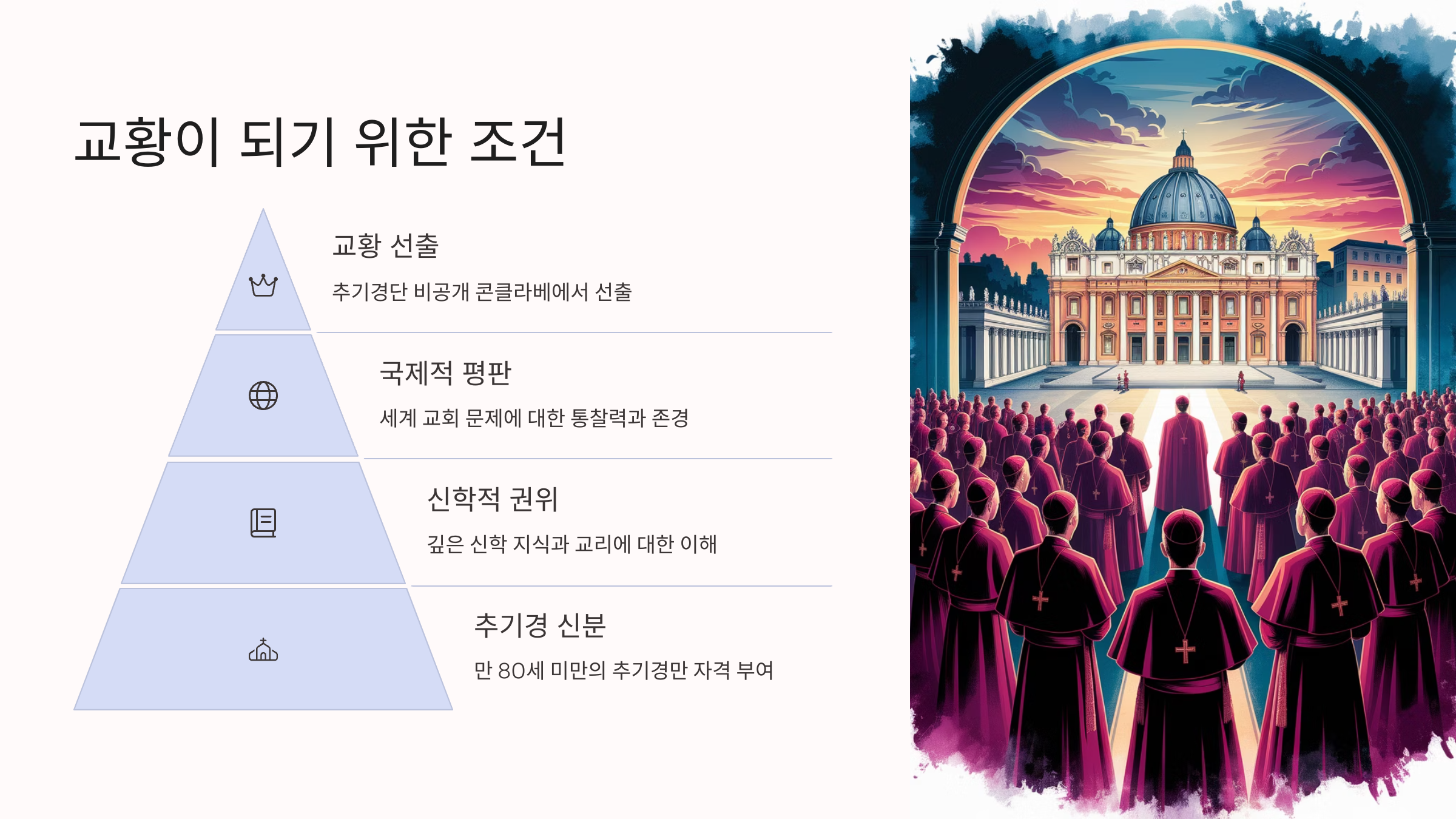 다음으로는 교황이 되기 위해 갖춰야 할 기본 조건과 과정, 그리고 선출 절차를 간단히 알려드릴게요! 한국 교황이 가능할지, 요건을 함께 확인해보면 더 재밌어요!