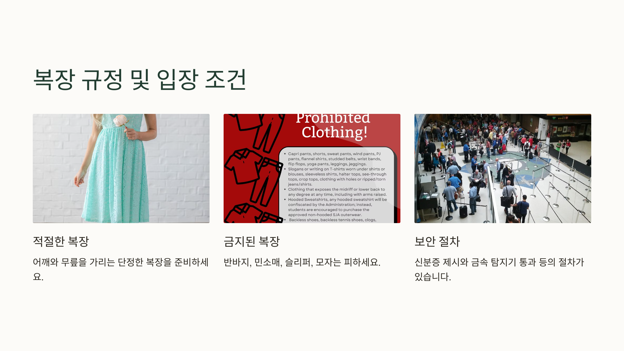 | 짧은 반바지 / 치마 | 입장 불가 | 무릎 아래 길이 필수 |
