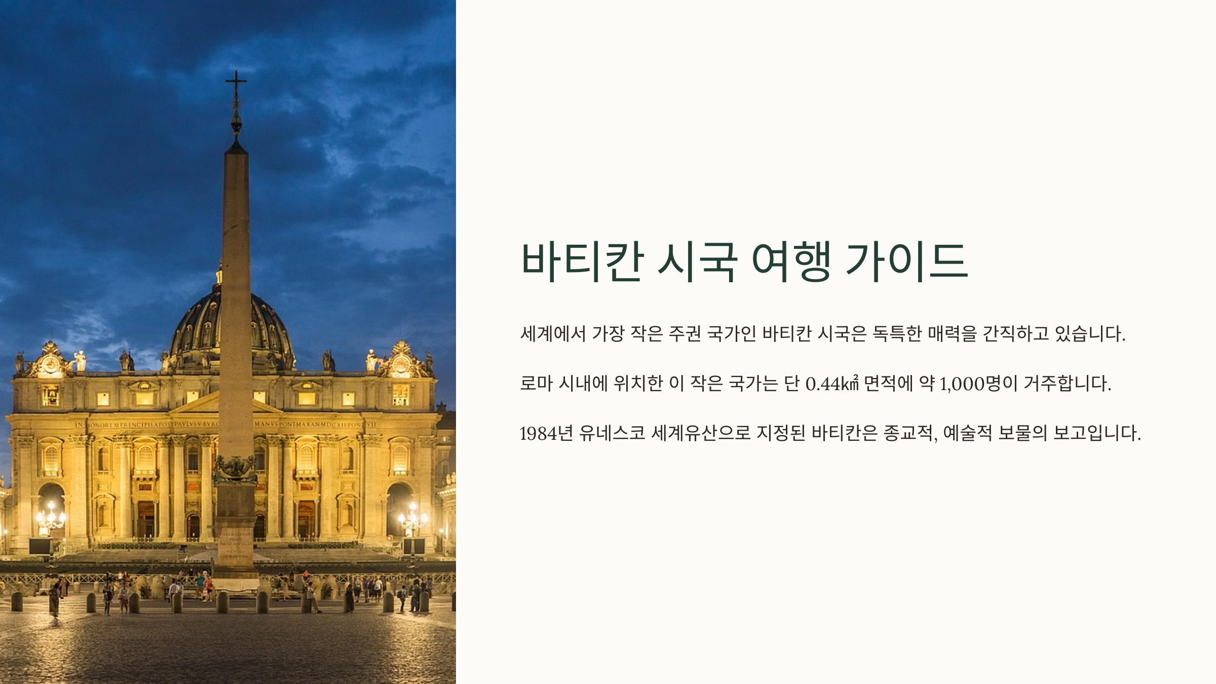 이제 바티칸 시국 기본 정보부터 시작해서 대표 명소, 관람 팁, 교황 알현까지 이어서 알려드릴게요!