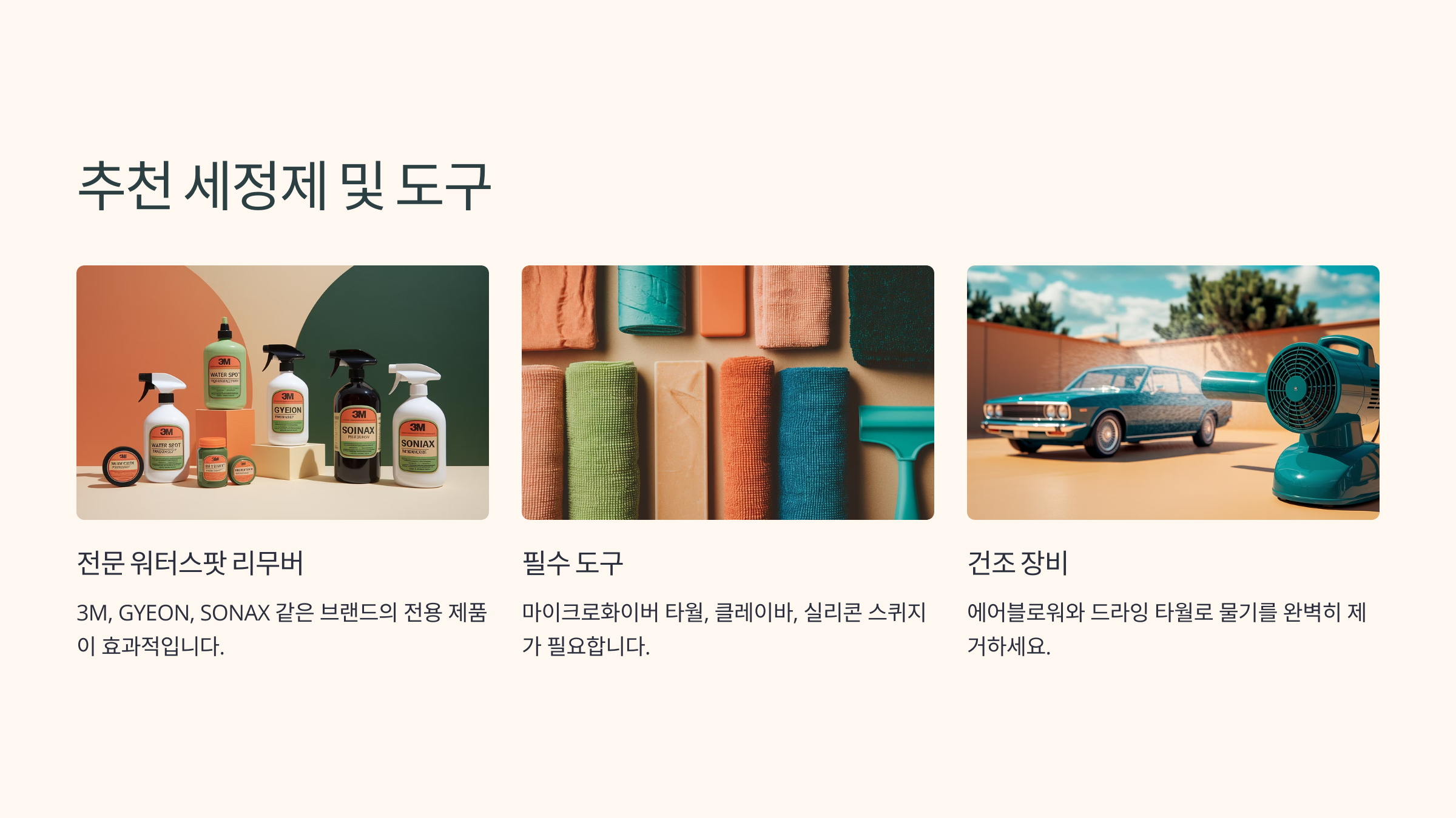 | 스케일 리무버 | 차량 전용 약산성 리무버 + 극세사 | 강력한 석회 제거 | 도장면, 유리 |
