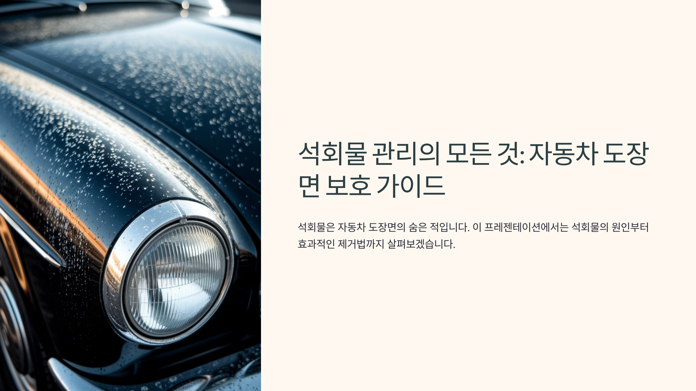 주차장 천장이나 고인 물에 의한 석회물 얼룩, 자동차 위에 하얀 얼룩처럼 남아 본 적 있으시죠? 이 석회물 얼룩은 단순한 미관 문제가 아니라, 차량 도장면에 손상을 줄 수도 있어요.