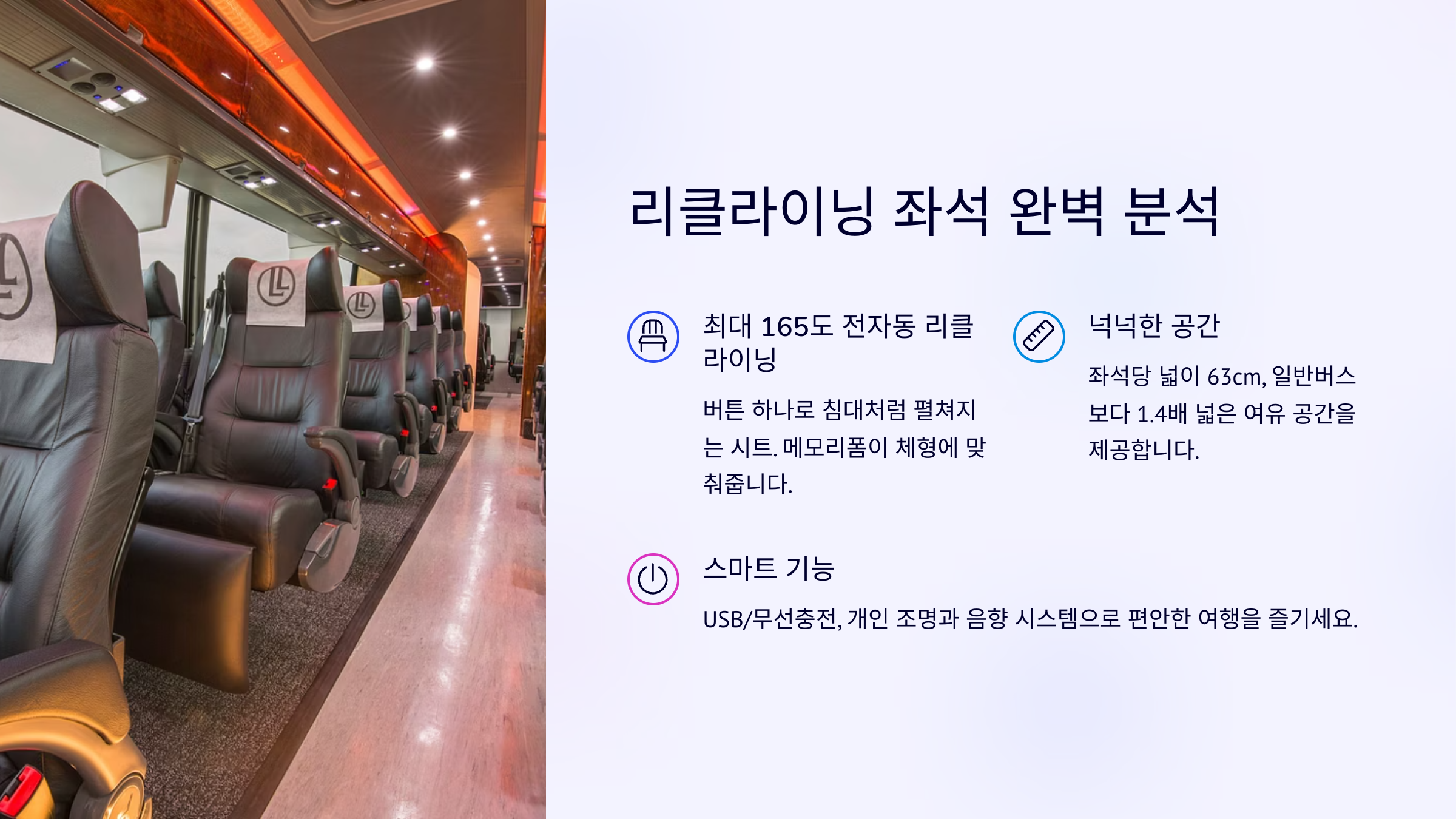 내가 생각했을 때 이 버스의 진짜 강점은, '장시간 이동 중에도 피로가 덜하다'는 점이에요. 직접 타보면 정말 푹신한 침대에 앉아 있는 것 같은 착각이 들 만큼, 신체의 부담을 최소화한 구조가 인상적이었어요. 🛌