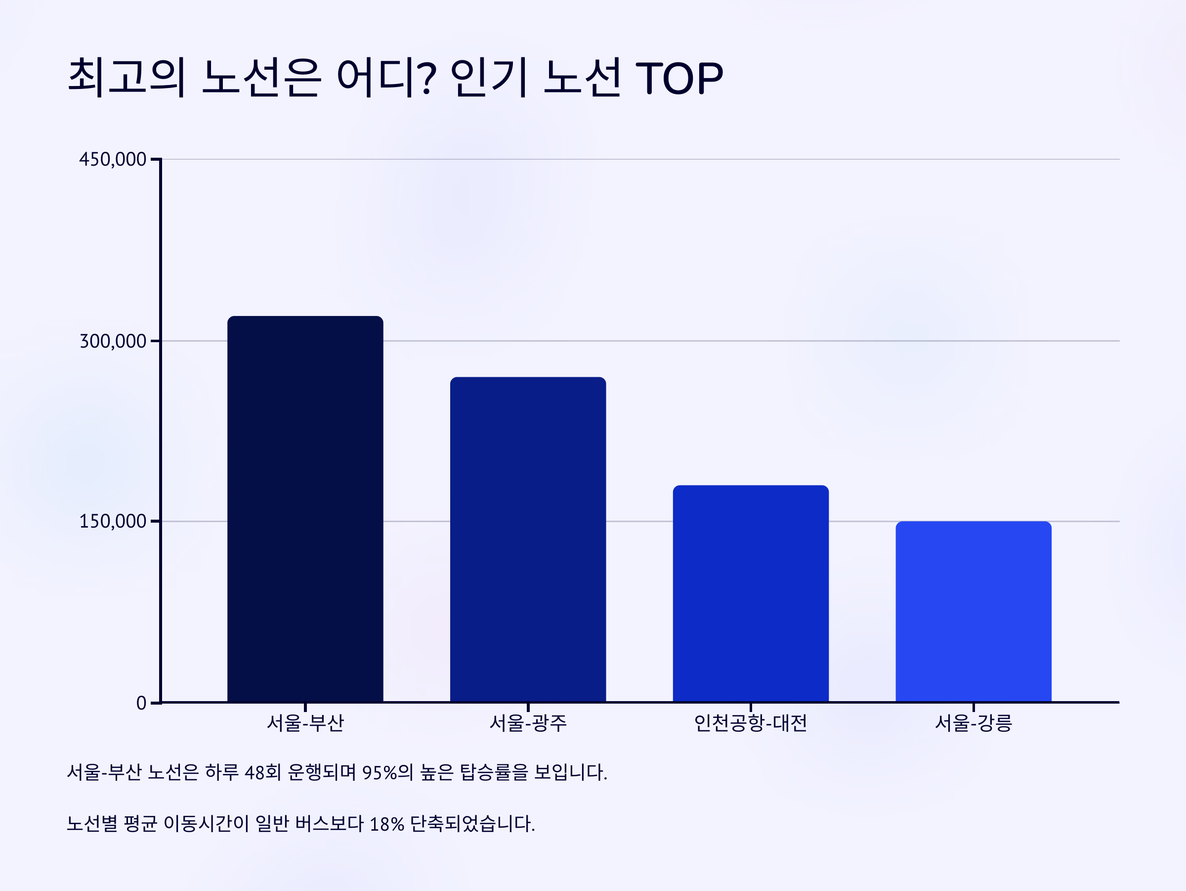 가장 인기 있는 노선은 단연 서울-부산이에요. 약 4시간 30분 정도 소요되지만, 프리미엄 좌석 덕분에 오히려 기차보다 편하다는 평가도 있어요. 다음으로는 서울-광주, 서울-강릉, 서울-대구 노선도 꾸준한 인기를 누리고 있어요.