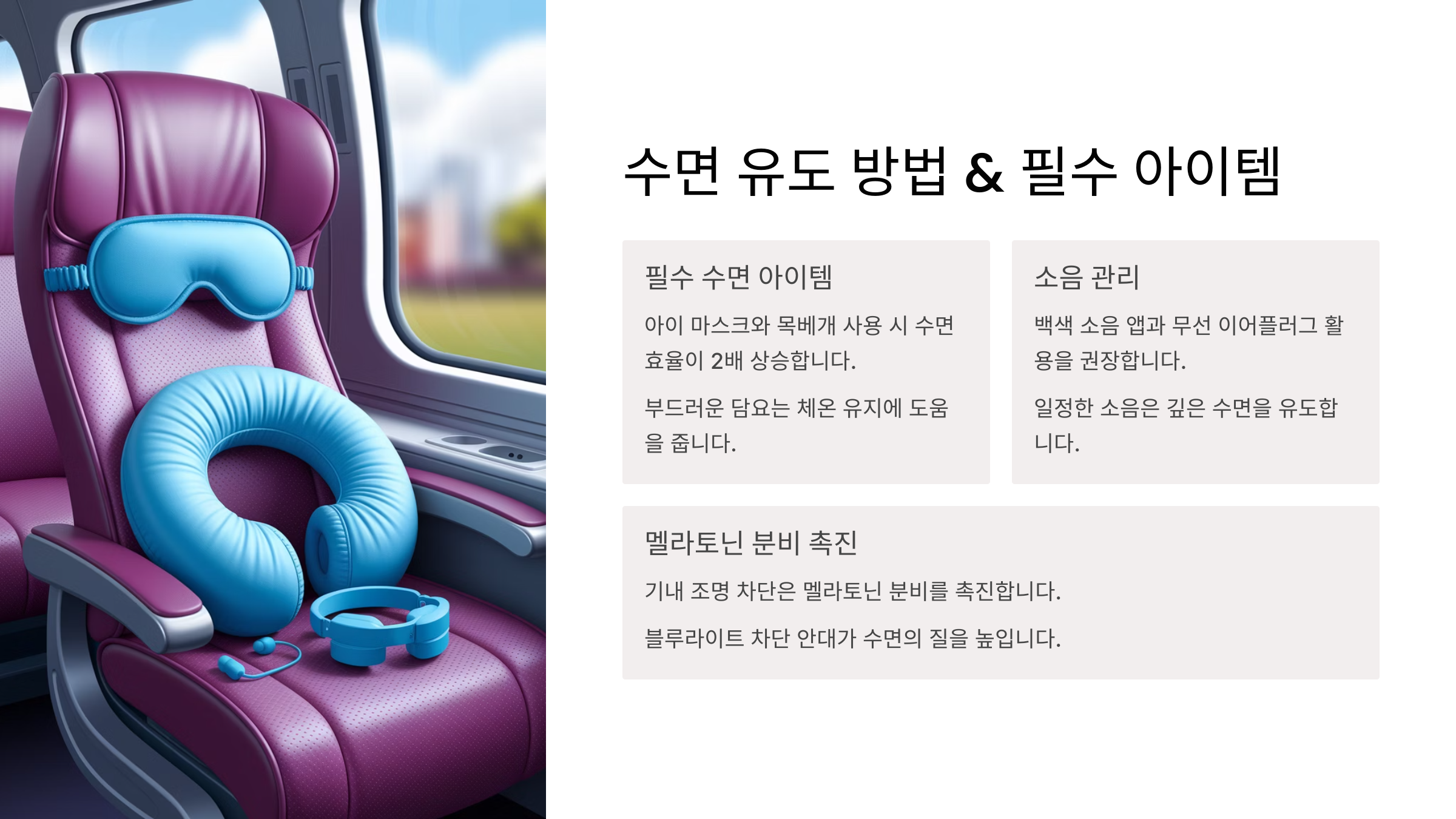 우선 목베개는 필수템이에요. 좌석이 아무리 편해도 고개가 흔들리면 자는 내내 피곤하죠. 목을 고정해주면 수면 중 목과 어깨에 가해지는 부담이 확 줄어요. 특히 U자형 메모리폼 목베개는 완전 추천이에요.