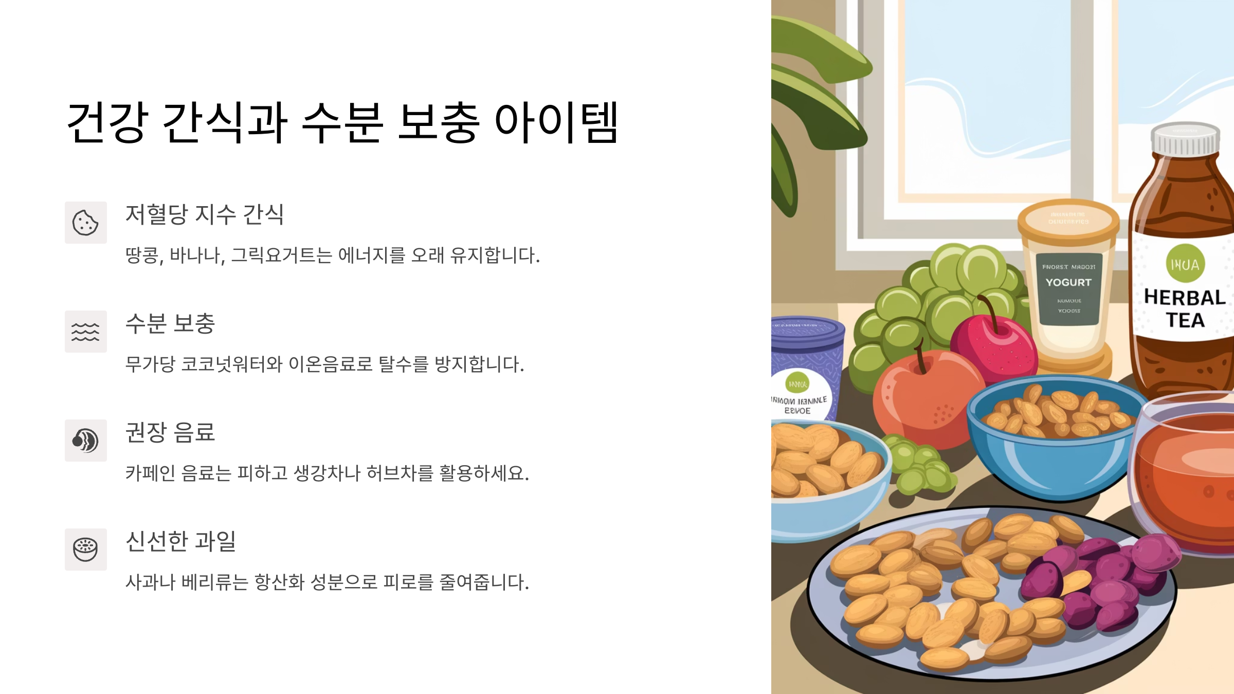 숙면 아이템까지 챙겼다면, 이제 건강한 간식과 음료로 속까지 든든하게 만들어볼까요? 🍎