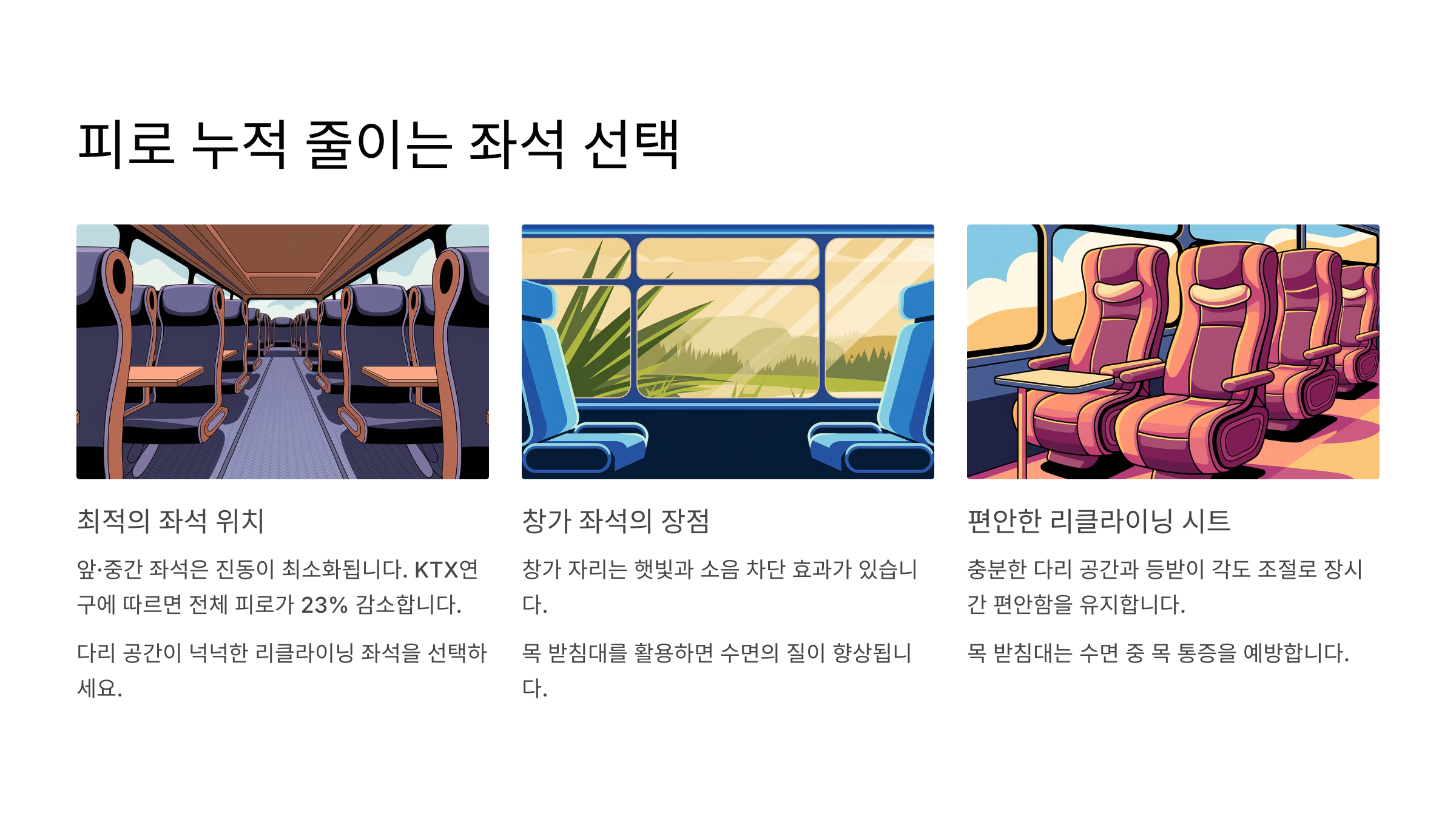 특히 리클라이닝 좌석을 잘 활용하고, 탑승 전 몸을 풀어주고, 간식이나 음료까지 준비하면 ‘움직이는 힐링룸’이 완성돼요. 단순히 이동하는 게 아니라 회복되는 시간이 되는 거죠 😊