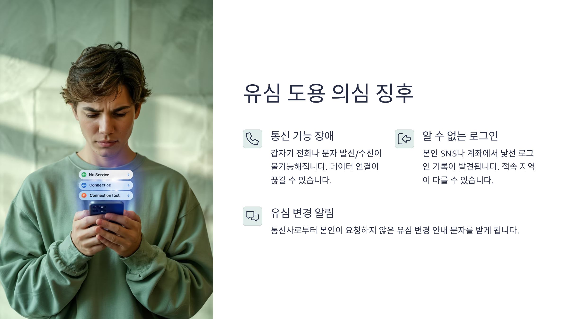 유심 도용을 의심해야 할 때가 있어요. 가장 흔한 징후는 갑자기 휴대폰 신호가 끊기는 경우예요. 평소 잘 터지던 곳에서 '서비스 없음'이 뜬다면 바로 의심해야 해요.