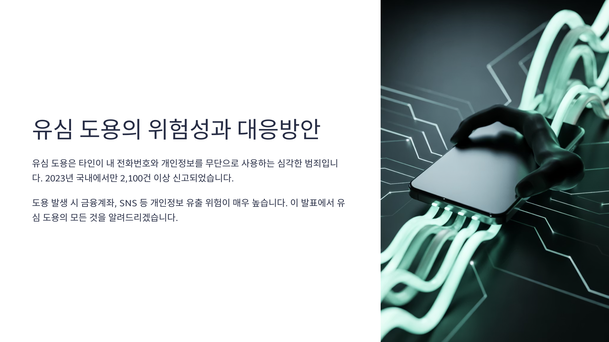 첫 번째로, 유심 도용이란 내 신원을 도용해서 유심을 재발급받는 범죄라는 걸 알아봤어요. 내 번호를 뺏기면 금융, SNS 모두 탈취당할 수 있죠.