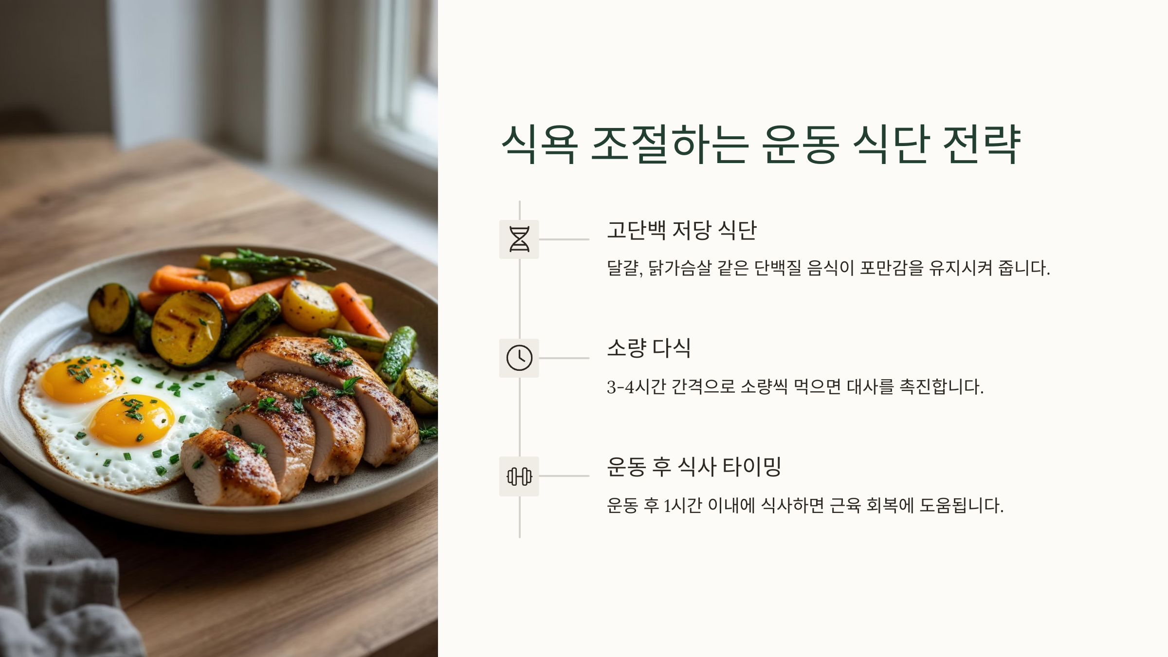 적당한 탄수화물, 충분한 단백질, 건강한 지방을 골고루 섭취하면서 몸에 무리가 가지 않게 조절하는 게 핵심이에요.